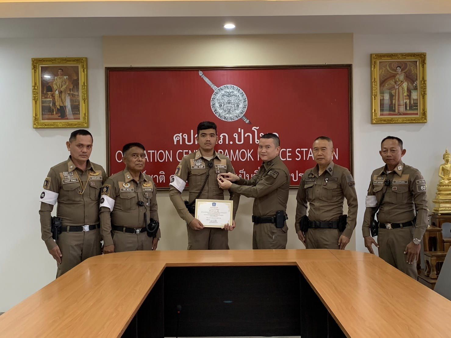 ผกก.สภ.ป่าโมก ได้มอบประกาศนียบัตร ให้แก่ส.ต.ต.วรภัทร พันธุ์ดี ผบ.หมู่ จราจร สภ.ป่าโมก ในกรณี ช่วยเหลือผู้ประสบอุบัติเหตุรถจักรยานยนต์พุ่งชนรถบรรทุกพ่วง บริเวณสี่แยกผักไห่สายใน ถนน 3501 ม.3 ต.ป่าโมก อ.ป่าโมก จ.อ่างทอง พร้อมทั้งได้มอบของที่ระลึกเพื่อเป็นขวัญและกำลังใจในการปฏิบัติหน้าที่ต่อไป