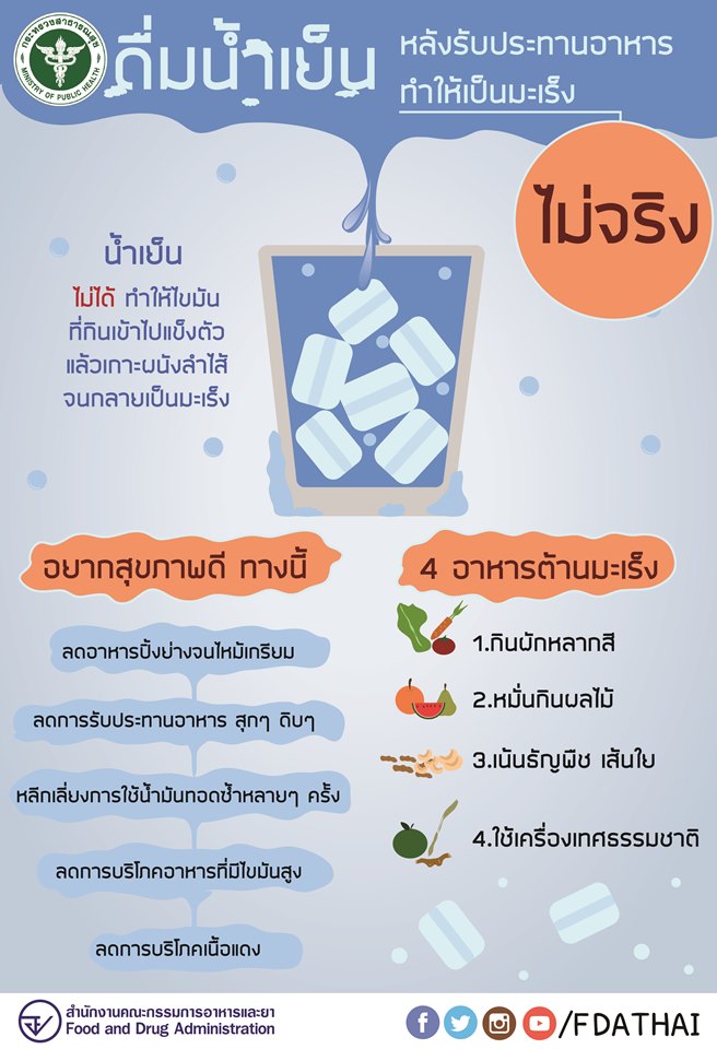 3.”ดื่มน้ำเย็น หลังกินข้าว ทำให้เป็นมะเร็งจริงหรือไม่” ตอบเลยว่า “ไม่จริง”
