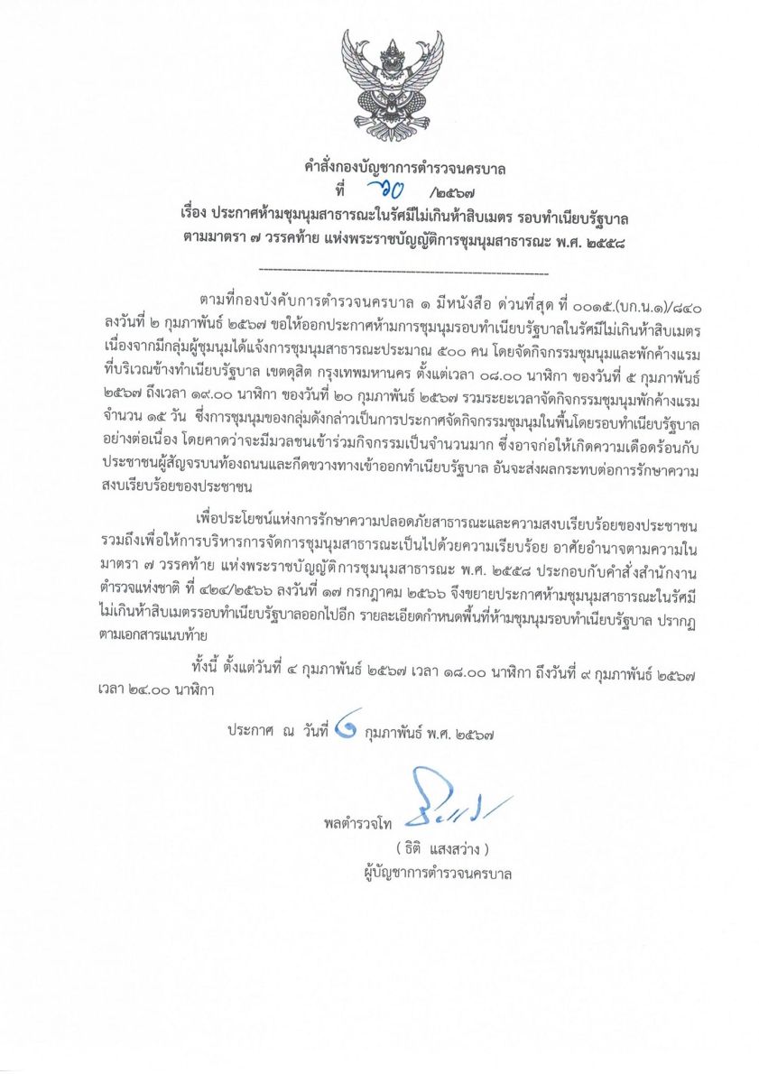 เมื่อวันที่ 6 ก.พ. 2567 พล.ต.ท.ธิติ แสงสว่าง ผู้บัญชาการตำรวจนครบาล (ผบช.น.) ได้ลงนามคำสั่งบช.น. ที่ 60/2567 เรื่อง ประกาศห้ามชุมนุมสาธารณะในรัศมีไม่เกิน 50 เมตร รอบทำเนียบรัฐบาลตาม มาตรา 7 วรรคท้าย แห่งพระราชบัญญัติ (พ.ร.บ.) การชุมนุมสาธารณะ พ.ศ.2558