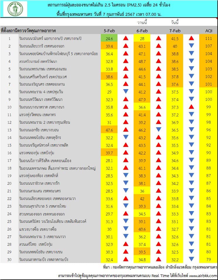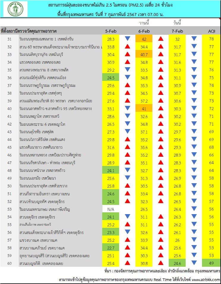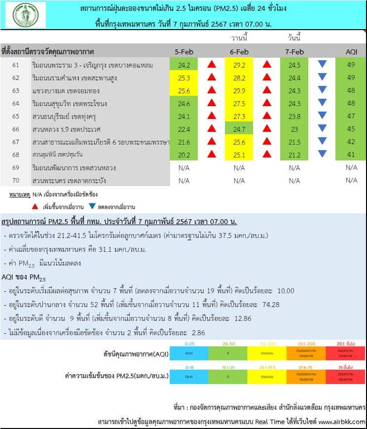 ศูนย์ข้อมูลคุณภาพอากาศกรุงเทพมหานครขอรายงานสถานการณ์ฝุ่นละออง PM 2.5 ของสถานีตรวจวัดคุณภาพอากาศของกรุงเทพมหานคร ประจำวันพุธที่ 7 กุมภาพันธ์ พ.ศ. 2567 เวลา 07.00 น. ค่าเฉลี่ย 24 ชั่วโมง ของฝุ่นละอองขนาดไม่เกิน 2.5 ไมครอน (PM2.5) ตรวจวัดได้ 21.2-41.5 ไมโครกรัม/ลูกบาศก์เมตร (มคก./ลบ.ม.) พบว่าเกินมาตรฐานอยู่ในระดับสีส้ม เริ่มมีผลกระทบต่อสุขภาพ (มาตรฐานไม่เกิน 37.5 มคก./ลบ.ม.) จำนวน 7 พื้นที่คือ