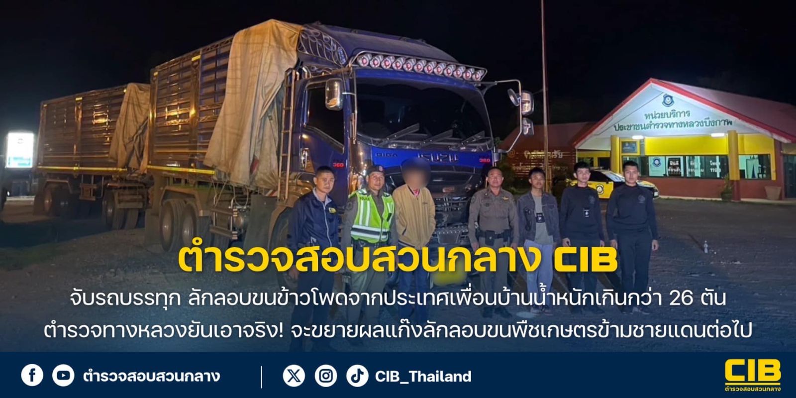 ตำรวจสอบสวนกลาง (CIB) โดย กองบังคับการตำรวจทางหลวง (บก.ทล.) ร่วมกันจับกุม นายเอ (นามสมมุติ) กระทำผิดฐาน “ใช้ยานพาหนะที่มีน้ำหนักบรรทุกเกินกว่าอัตราที่กฎหมายกำหนดมาใช้บนทางหลวง”
