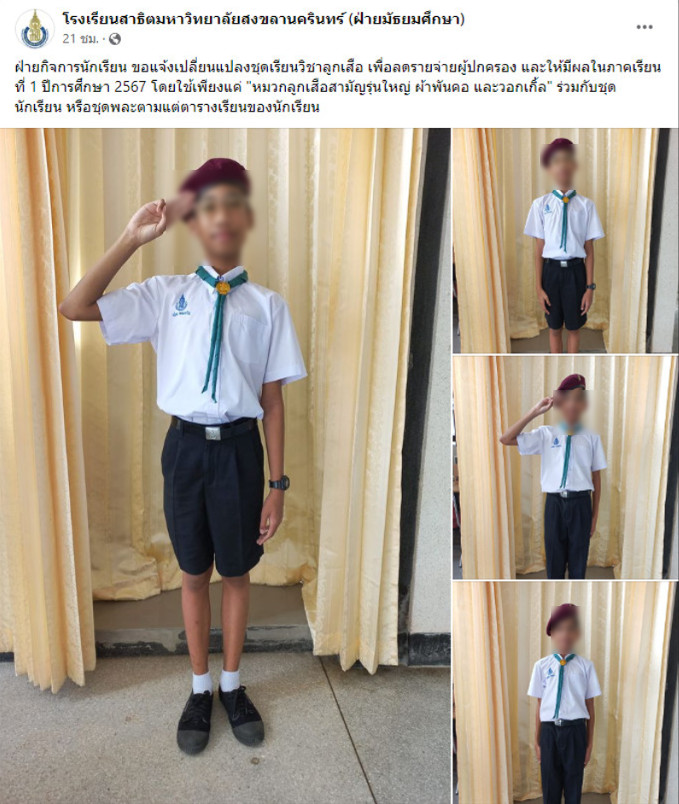 7 กุมภาพันธ์ 2567 โลกออนไลน์แห่แชร์ โพสต์ของโรงเรียนสาธิตมหาวิทยาลัยสงขลานครินทร์ (ฝ่ายมัธยมศึกษา) ที่ประกาศว่า ฝ่ายกิจการนักเรียน ขอแจ้งเปลี่ยนแปลงชุดเรียนวิชาลูกเสือ เพื่อลดรายจ่ายผู้ปกครอง โดยให้มีผลตั้งแต่ภาคเรียนที่ 1 ปีการศึกษา 2567 โดยใช้เพียงแค่ "หมวกลูกเสือสามัญรุ่นใหญ่ ผ้าพันคอ และวอกเกิ้ล" ร่วมกับชุดนักเรียน หรือ ชุดพละ ตามแต่ตารางเรียนของนักเรียน