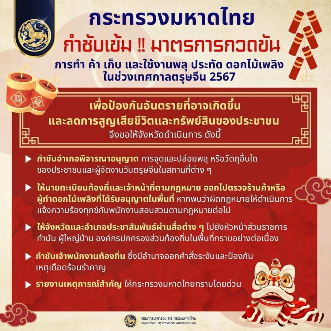 (7 ก.พ.67) กระทรวงมหาดไทย กำชับ ผู้ว่าฯ นายอำเภอ กวดขัน ระวังอันตรายให้กับประชาชนในการจุดประทัด จุดพลุ เฉลิมฉลองในช่วงเทศกาลตรุษจีน 8 - 10 กุมภาพันธ์ 2567 เน้นย้ำ เจ้าหน้าที่ฝ่ายปกครองดำเนินมาตรการอย่างเคร่งครัด เพื่อความสุขและความปลอดภัยของพี่น้องประชาชน