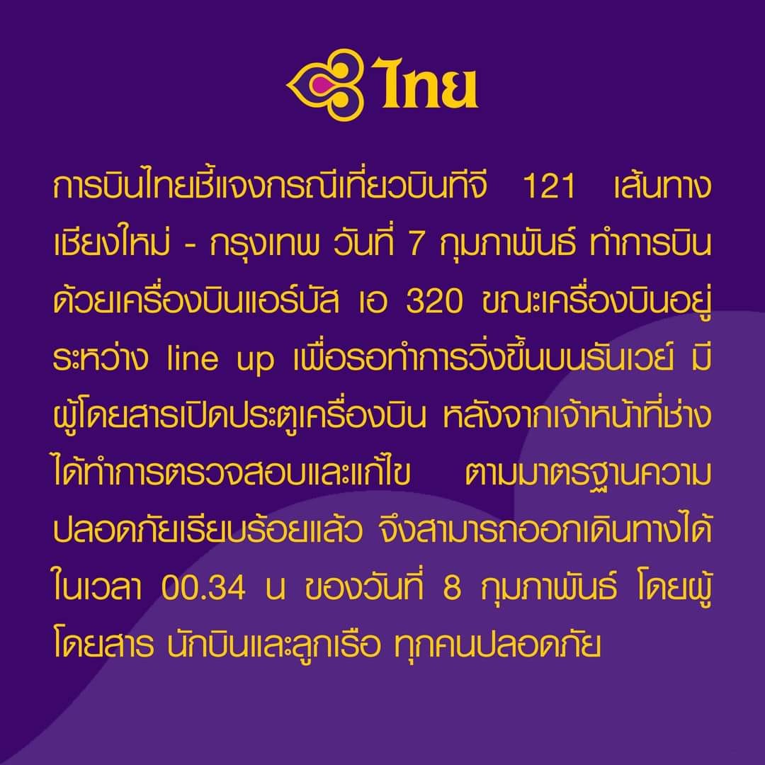 บริษัท การบินไทย จำกัด (มหาชน) ได้ชี้แจงกรณีเที่ยวบินทีจี 121 เส้นทางเชียงใหม่ – กรุงเทพ วันที่ 7 กุมภาพันธ์ ทำการบินด้วยเครื่องบินแอร์บัส เอ 320 ขณะเครื่องบินอยู่ระหว่างไลน์ อัพ (line up) เพื่อรอทำการวิ่งขึ้นบนรันเวย์ ได้มีผู้โดยสารเปิดประตูเครื่องบิน