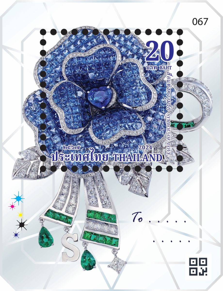 ไปรษณีย์ไทยได้รับพระกรุณาธิคุณให้ร่วมงานกับแบรนด์ SIRIVANNAVARI นำภาพเครื่องประดับ “Rosa Bhubing Love at First Sight Gradient Brooch” หนึ่งในผลงานทรงออกแบบโดยสมเด็จพระเจ้าลูกเธอ เจ้าฟ้า สิริวัณณวรี นารีรัตนราชกัญญา จากคอลเลกชัน “Heirlooms of Elegance” ผนวกกับผลงานหัตถศิลป์ด้านอัญมณี โดยช่างฝีมือชั้นครูจาก BEAUTY GEMS มาจัดทำเป็นแสตมป์ชุดสื่อแห่งความรัก 2567 ถ่ายทอดเบื้องหลังแห่งแรงบันดาลใจในงานทรงออกแบบเรื่องราวอันเปี่ยมด้วยความหมาย เชื่อมโยงกับกุหลาบสีน้ำเงินอันเป็นที่ทรงโปรดของสมเด็จพระนางเจ้าสิริกิติ์ พระบรมราชินีนาถ พระบรมราชชนนีพันปีหลวง ซึ่งพสกนิกรได้นำดอกกุหลาบควีนสิริกิติ์ ดอกไม้พระนามอันงดงามซึ่งเป็นดอกกุหลาบสีเหลือง ปลายกลีบสีส้มอ่อน มาย้อมสีน้ำเงินสดทูลเกล้าฯ ถวาย เมื่อครั้งเสด็จมาทรงงาน ณ พระตำหนักภูพิงคราชนิเวศน์ โดยองค์ดีไซเนอร์ได้ทรงออกแบบชิ้นงาน ให้มีความละเอียดอ่อนช้อย และทรงเลือกวาง สีอัญมณี ลูกเล่นของกลีบดอก ก้านและใบ สู่ชิ้นงานสุดล้ำค่าสมบูรณ์แบบโดยไปรษณีย์ไทยได้เลือกใช้เทคนิคการพิมพ์ ซิลค์สกรีนหมึกพิมพ์หลากสี พร้อมเคลือบกลิตเตอร์ เพิ่มประกายระยิบระยับใกล้เคียงอัญมณีจริง