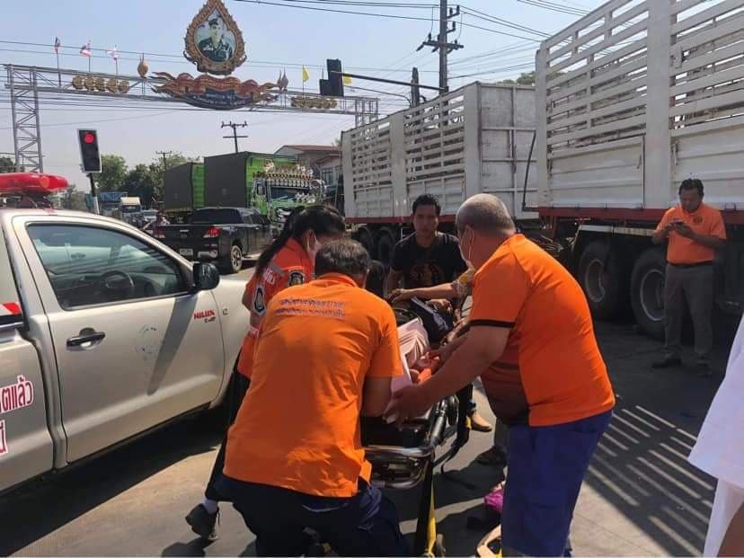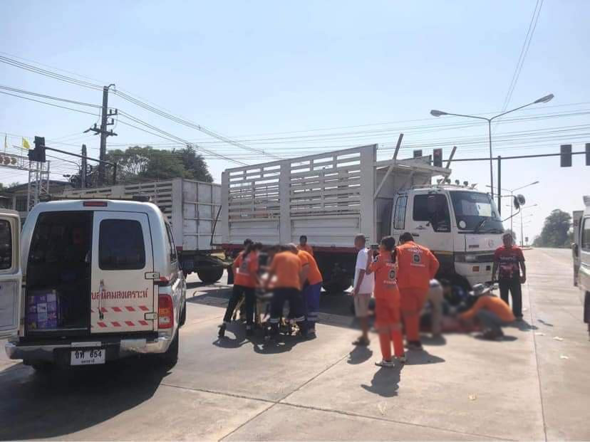 รถจักรยานยนต์ ชนกับรถพ่วงกลางสี่แยกไฟแดง มีผู้เสียชีวิต 2 ศพ จ.อุดรธานี