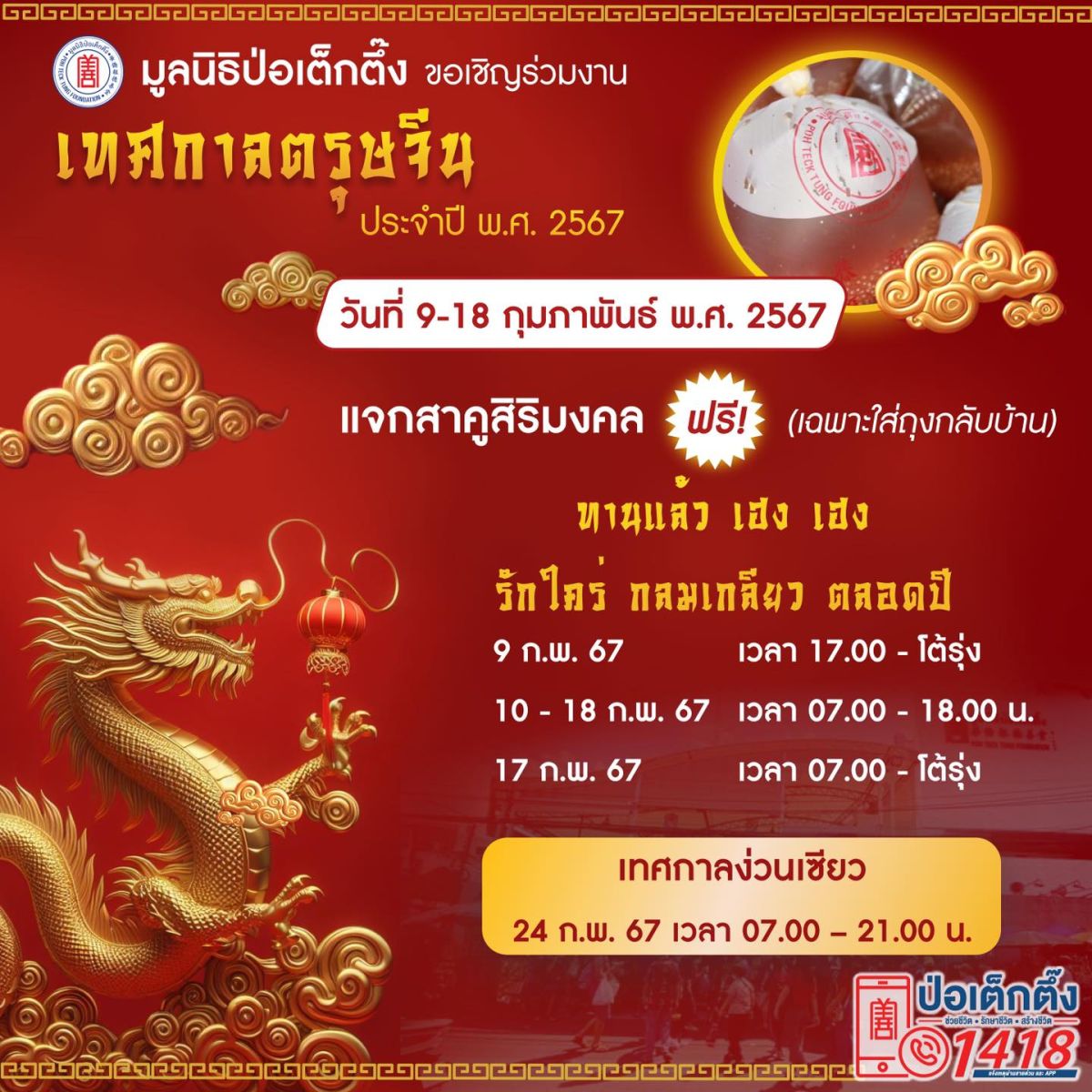 มูลนิธิป่อเต็กตึ๊ง ขอเชิญร่วมงานเทศกาลตรุษจีน ประจำปี พ.ศ. 2567 วันที่ 9-18 กุมภาพันธ์ พ.ศ. 2567