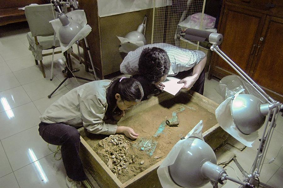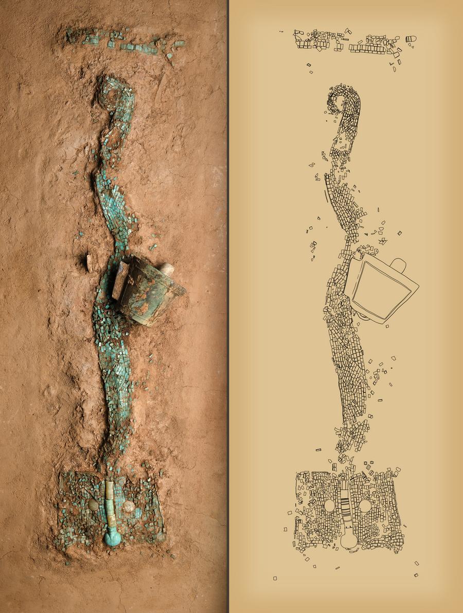 รายงานระบุว่าโบราณวัตถุสีฟ้าแกมเขียวสดใสชิ้นนี้มีความยาวรวมกว่า 70 เซนติเมตร ปัจจุบันถูกเก็บรักษาอยู่ที่พิพิธภัณฑ์โบราณคดีจีนในกรุงปักกิ่ง เมืองหลวงของประเทศ