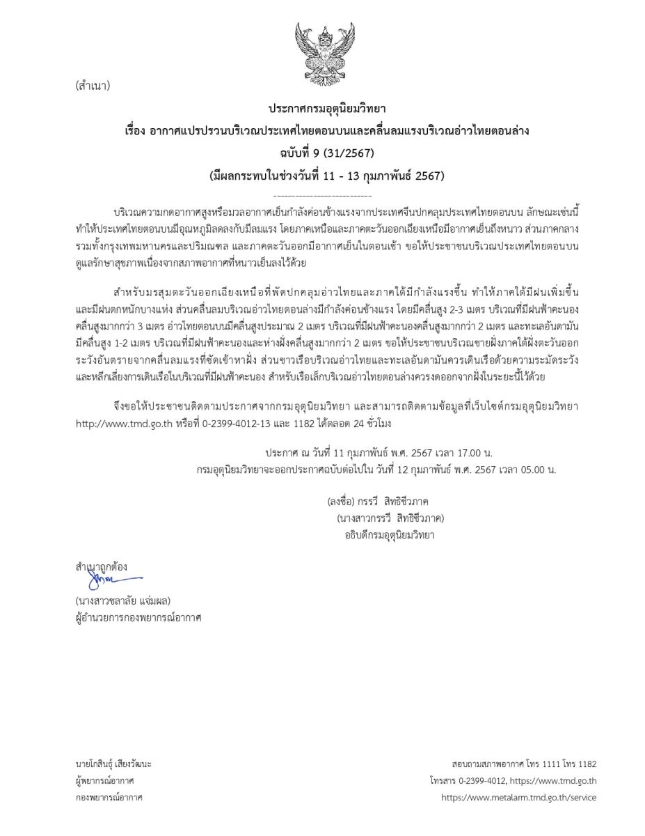 ประกาศกรมอุตุนิยมวิทยา อากาศแปรปรวนบริเวณประเทศไทยตอนบนและคลื่นลมแรงบริเวณอ่าวไทยตอนล่าง ฉบับที่ 9 (31/2567) (มีผลกระทบในช่วงวันที่ 11 - 13 กุมภาพันธ์ 2567) บริเวณความกดอากาศสูงหรือมวลอากาศเย็นกำลังค่อนข้างแรงจากประเทศจีนปกคลุมประเทศไทยตอนบน ลักษณะเช่นนี้ทำให้ประเทศไทยตอนบนมีอุณหภูมิลดลงกับมีลมแรง โดยภาคเหนือและภาคตะวันออกเฉียงเหนือมีอากาศเย็นถึงหนาว ส่วนภาคกลาง รวมทั้งกรุงเทพมหานครและปริมณฑล และภาคตะวันออกมีอากาศเย็นในตอนเช้า ขอให้ประชาชนบริเวณประเทศไทยตอนบนดูแลรักษาสุขภาพเนื่องจากสภาพอากาศที่หนาวเย็นลงไว้ด้วย