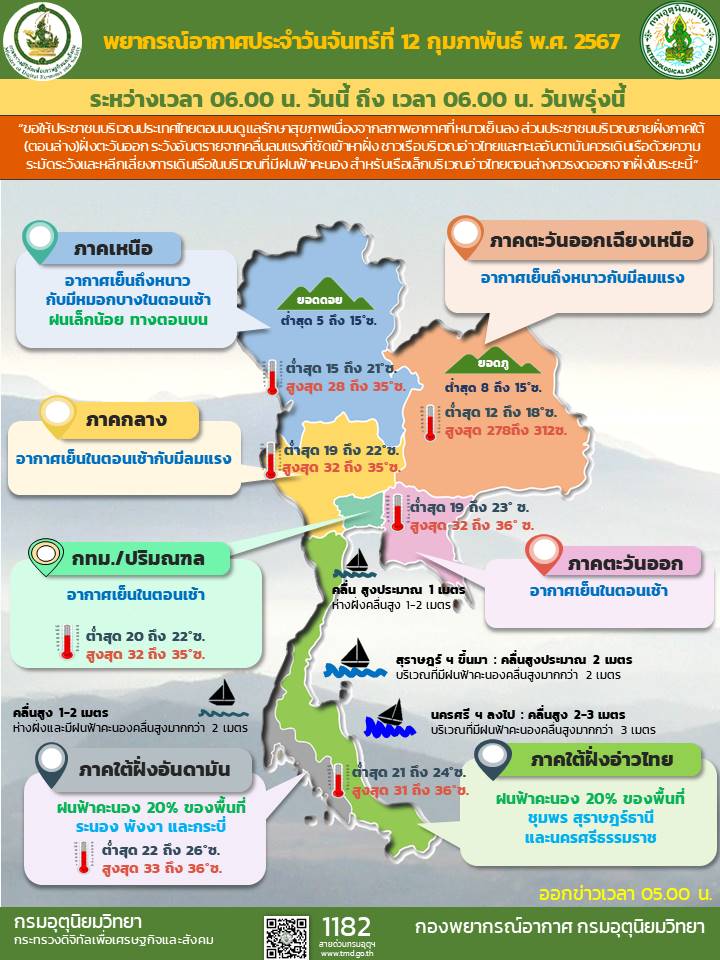 ลักษณะอากาศทั่วไป วันที่ 12 กุมภาพันธ์ 2567 พยากรณ์อากาศ 24 ชั่วโมงข้างหน้า บริเวณความกดอากาศสูงหรือมวลอากาศเย็นกำลังค่อนข้างแรงจากประเทศจีนปกคลุมประเทศไทยตอนบน ลักษณะเช่นนี้ทำให้ภาคเหนือและภาคตะวันออกเฉียงเหนือมีอากาศเย็นถึงหนาว