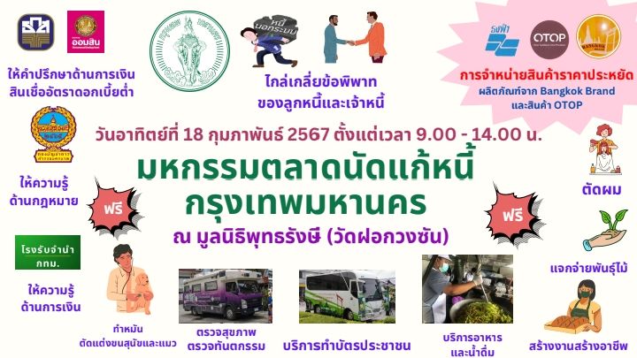 ด้านนายศานนท์ หวังสร้างบุญ รองผู้ว่าราชการกรุงเทพมหานคร กล่าวเพิ่มเติมว่า ในวันที่ 18 ก.พ. นี้ กรุงเทพมหานครร่วมกับหน่วยงานที่เกี่ยวข้อง จะจัดมหกรรมตลาดนัดแก้หนี้กรุงเทพมหานคร ณ มูลนิธิพุทธรังสี (วัดฝอกวงซัน) เขตคลองสามวา ระหว่างเวลา 09.00 - 14.00 น. ซึ่งเขตคลองสามวา ถือว่าเป็นเขตที่มียอดการลงทะเบียนมากที่สุด โดยกิจกรรมประกอบด้วย การให้คำปรึกษาด้านการเงิน สินเชื่ออัตราดอกเบี้ยต่ำ การให้ความรู้ด้านกฎหมาย การให้ความรู้ด้านการเงิน การไกล่เกลี่ยข้อพิพาทของลูกหนี้และเจ้าหนี้ รวมทั้งมีการจำหน่ายสินค้าราคาประหยัด (Bangkok Brand, OTOP) ตัดผม แจกจ่ายพันธุ์ไม้ สร้างงานสร้างอาชีพ บริการอาหารและน้ำดื่ม บริการทำบัตรประชาชน ตรวจสุขภาพ ตรวจทันตกรรม ทำหมัน-ตัดแต่งขนสุนัขและแมว ซึ่งประชาชนสามารถร่วมกิจกรรมได้โดยไม่เสียค่าใช้จ่าย