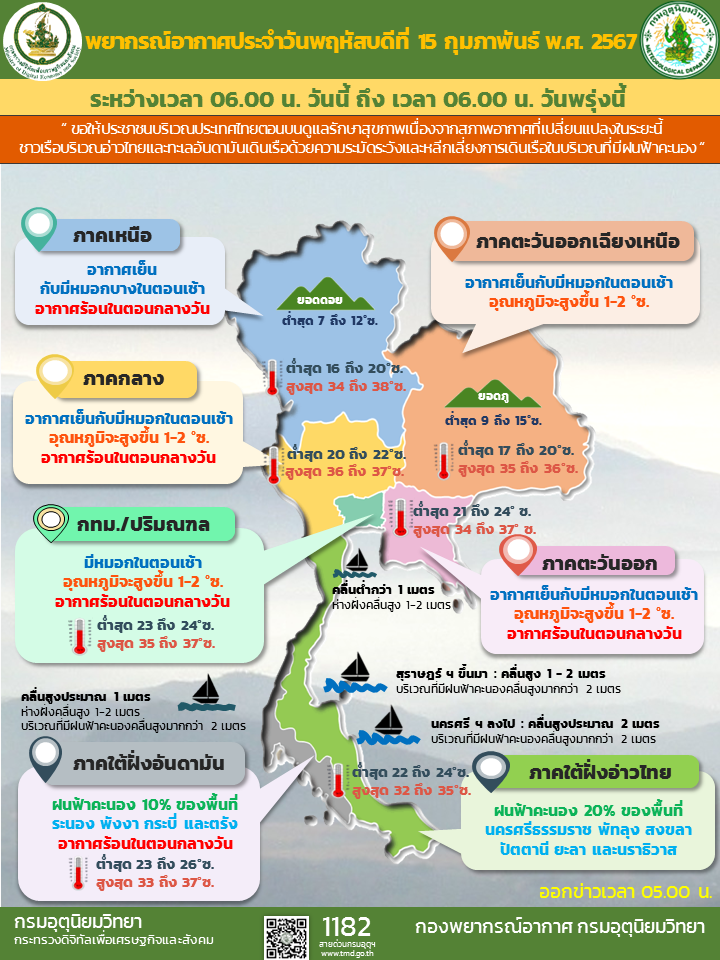 ลักษณะอากาศทั่วไป วันที่ 15 กุมภาพันธ์ 2567 พยากรณ์อากาศ 24 ชั่วโมงข้างหน้า บริเวณความกดอากาศสูงหรือมวลอากาศเย็นกำลังปานกลางที่ปกคลุมประเทศไทยตอนบนมีแนวโน้มกำลังอ่อนลงอีก ทำให้ประเทศไทยตอนบนมีอุณหภูมิสูงขึ้น โดยมีอากาศร้อนในตอนกลางวัน แต่ยังคงมีอากาศเย็นกับมีหมอกในตอนเช้า ขอให้ประชาชนในบริเวณดังกล่าวดูแลรักษาสุขภาพเนื่องจากสภาพอากาศที่เปลี่ยนแปลงในระยะนี้