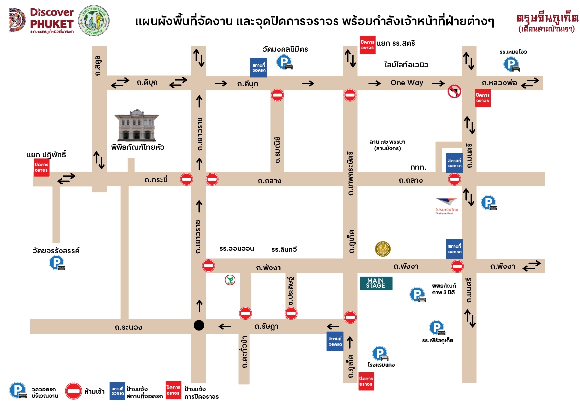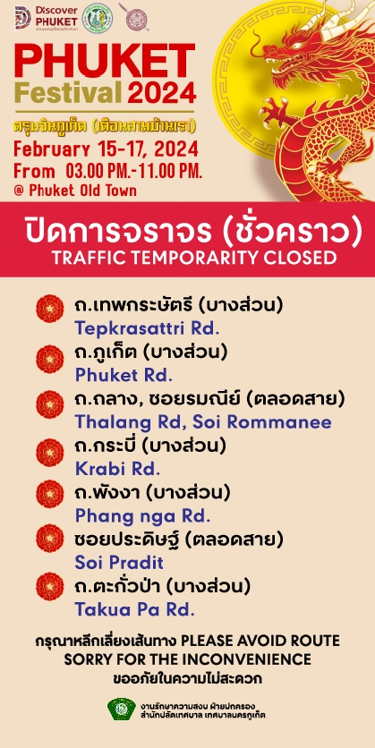 จัดงานตรุษจีนภูเก็ต (เดือนสามบ้านเรา) ประจำปี 2567 “Phuket Festival 2024” จึงมีความจำเป็นต้องปิดการจราจรในระหว่าง 15 - 17 กุมภาพันธ์ 2567 ตั้งแต่เวลา 15.00 - 24.00 น. บริเวณถนนสายต่างๆ ดังนี้