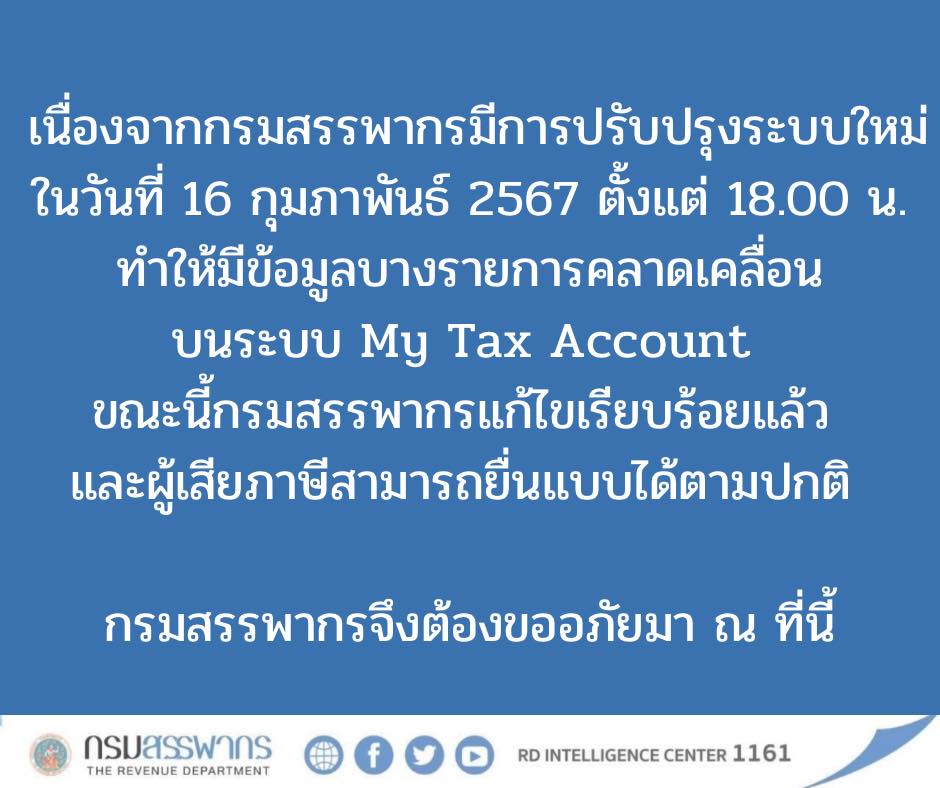 ล่าสุด กรมสรรพากร ชี้แจง ยอมรับระบบขัดข้อง เนื่องจากกรมฯ มีการปรับปรุงระบบใหม่ในวันที่ 16 กุมภาพันธ์ ตั้งแต่เวลา 18.00 น. ทำให้มีข้อมูลบางรายการคลาดเคลื่อน บนระบบ myTax Account ขณะนี้แก้ไขเรียบร้อยแล้ว และผู้เสียภาษีสามารถยื่นแบบได้ตามปกติ จึงต้องขออภัยมา ณ ที่นี้