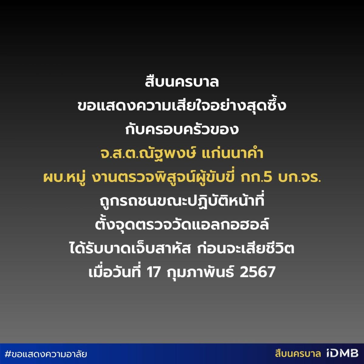 ต่อมา เวลา 15.30 น. กองกำกับการ 5 บก.จร. ได้แจ้งว่า จ.ส.ต.ณัฐพงษ์ แก่นนาคำ ผบ. หมู่ งานตรวจพิสูจน์ผู้ขับขี่ กองกำกับการ 5 กองบังคับการตำรวจจราจร (กก.5 บก.จร.) เสียชีวิตแล้ว