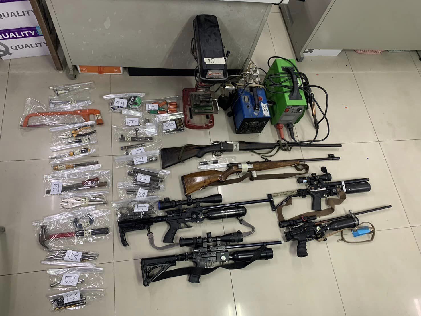 เจ้าหน้าที่ตำรวจจึงแจ้งข้อกล่าวหา ในความผิดฐาน “ทำ ประกอบ ซ่อมแซม มีอาวุธปืนและกระสุนปืนไว้ในครอบครองเพื่อจำหน่าย หรือสำหรับการค้าโดยไม่รับอนุญาตจากนายทะเบียน” พรบ.อาวุธปืนฯ มาตรา 24 และ “ทำอาวุธปืน หรือมีอาวุธปืนและเครื่องกระสุนปืนไว้ในครอบครองโดยไม่รับอนุญาตจากนายทะเบียน” พรบ.อาวุธปืนฯ มาตรา 7 พร้อมยึดของกลาง อาทิเช่น อาวุธปืนยาวเดี่ยวลูกซอง ไม่มีทะเบียน 1 กระบอก, อาวุธปืนยาวลูกกรด ไม่มีทะเบียน 1 กระบอก, อาวุธปืนยาวอัดลมแรงดันสูง PCP 4 กระบอก, กระสุนปืนขนาดต่างๆ กว่า 2,000 นัด, ปั๊มลมไฟฟ้า และอุปกรณ์สำหรับดัดแปลงอาวุธปืนจำนวนหลายรายการ แล้วควบคุมตัวไปยังที่ทำการของพนักงานสอบสวน สภ.ดอนหัวฬ่อ จว.ชลบุรี ดำเนินคดีตามกฎหมาย ผู้ถูกจับให้การปฎิเสธทั้ง 2 ข้อกล่าวหาตามคำแนะนำของทนายความ