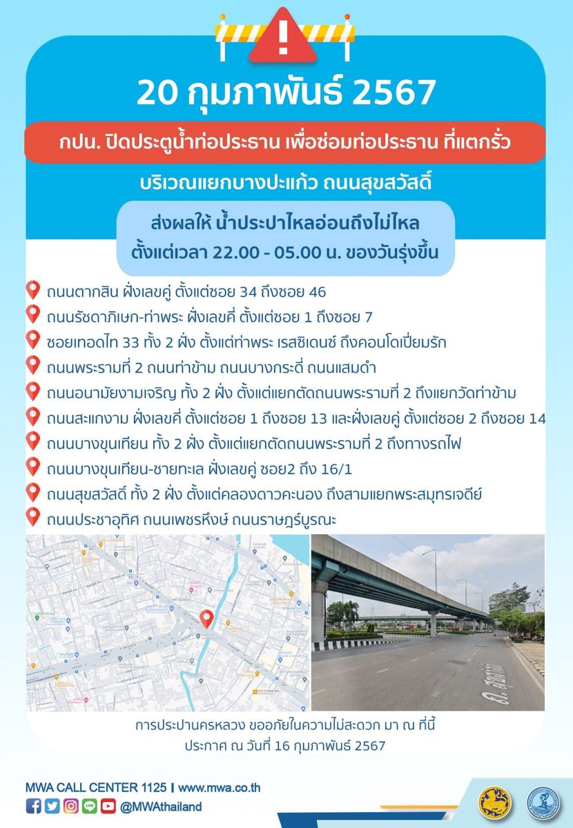 การประปานครหลวง (กปน.) มีความจำเป็นต้องปิดประตูน้ำท่อประธานขนาดเส้นผ่านศูนย์กลาง 700 มิลลิเมตร เพื่อซ่อมท่อประธาน ที่แตกรั่ว บริเวณแยกบางปะแก้ว ถนนสุขสวัสดิ์ ในคืนวันอังคารที่ 20 กุมภาพันธ์ 2567 ตั้งแต่เวลา 22.00 - 05.00 น. ของวันรุ่งขึ้น เพื่อให้ประชาชนได้รับบริการน้ำประปาอย่างเพียงพอและทั่วถึง โดยระหว่างดำเนินการ ส่งผลให้ น้ำประปาไหลอ่อนถึงไม่ไหล ในพื้นที่ดังต่อไปนี้