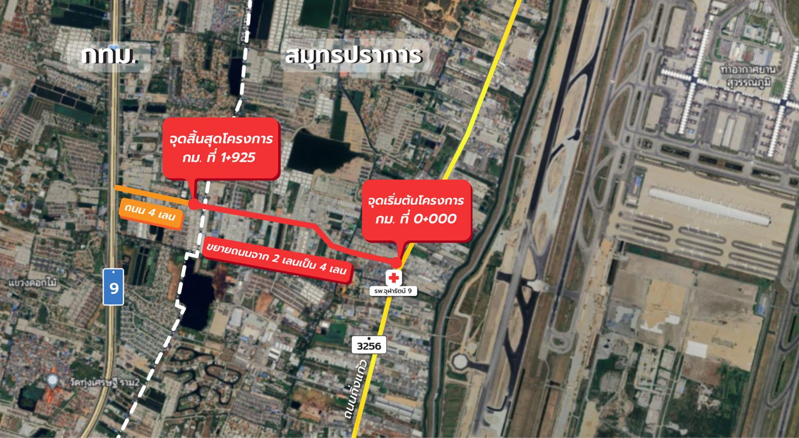 ทช. จึงได้ดำเนินการก่อสร้างถนนสาย ข1 ผังเมืองรวมเมืองสมุทรปราการ จังหวัดสมุทรปราการ ซึ่งเป็นถนนที่เชื่อมโยงระหว่างอำเภอบางพลี จังหวัดสมุทรปราการ กับเขตประเวศ กรุงเทพมหานคร (ระหว่าง ทล.3256 ถนนกิ่งแก้วกับถนนวงแหวนรอบนอกตะวันออก) มีจุดเริ่มต้นโครงการ กม.ที่ 0+000 เชื่อมจาก ทล.3256 (ถนนกิ่งแก้ว) ประมาณ กม.ที่ 17+090 ด้านซ้ายทาง ไปทางทิศตะวันตกตามแนวถนนคอนกรีตเดิม (ถนนทางหลวงชนบทสาย สป.4008 หรือซอยกิ่งแก้ว 25/1) ตัดผ่านคลองชวดลากข้าวและคลองสิงห์โต มีจุดสิ้นสุดโครงการ กม.ที่ 1+925 บรรจบกับถนนคอนกรีตเสริมเหล็กของเขตประเวศ กรุงเทพมหานคร รวมระยะทาง 1.925 กิโลเมตร โดยได้ก่อสร้างถนนจากเดิม 2 ช่องจราจร เป็นถนน 4 ช่องจราจร กว้างช่องละ 3.25 เมตร มีทางเท้า ซึ่งช่วง กม.ที่ 0+000 ถึง 0+100 ก่อสร้างเป็นผิวจราจรคอนกรีตเสริมเหล็กเชื่อมกับ ทล.3256 (ถนนกิ่งแก้ว) และตั้งแต่ช่วง กม.ที่ 0+100 ถึง 1+925 ก่อสร้างเป็นผิวจราจรแอสฟัลท์ติกคอนกรีต พร้อมก่อสร้างขยายสะพานคอนกรีตเสริมเหล็ก จำนวน 2 แห่ง ก่อสร้างระบบระบายน้ำ ระบบไฟฟ้าแสงสว่าง และสิ่งอำนวยความปลอดภัยตลอดสายทาง ใช้งบประมาณในการก่อสร้างรวม 157.850 ล้านบาท