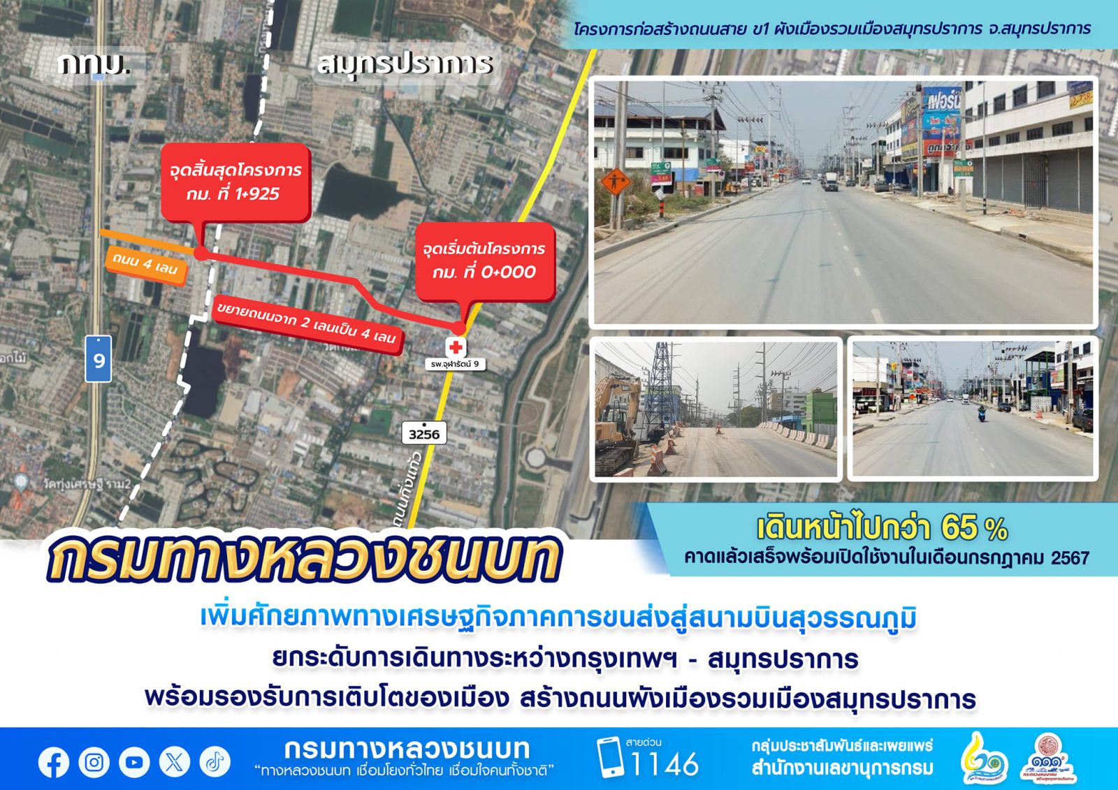 กรมทางหลวงชนบท เพิ่มศักยภาพทางเศรษฐกิจภาคการขนส่งสู่สนามบินสุวรรณภูมิ ยกระดับการเดินทางระหว่างกรุงเทพฯ - สมุทรปราการ คาดแล้วเสร็จ พร้อมเปิดใช้งาน ก.ค.67 นี้