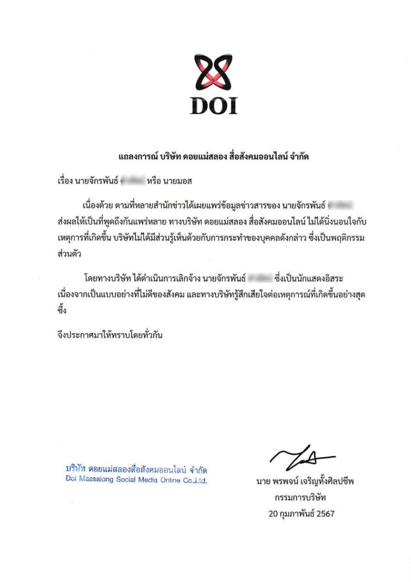 เนื่องด้วย ตามที่หลายสำนักข่าวได้เผยแพร่ข้อมูลข่าวสารของ นายจักรพันธ์ (ขอสงวนนามสกุล) ส่งผลให้เป็นที่พูดถึงกันแพร่หลาย ทางบริษัท ดอยแม่สลอง สื่อสังคมออนไลน์ ไม่ได้นิ่งนอนใจกับเหตุการที่เกิดขึ้น บริษัทไม่ได้มีส่วนรู้เห็นด้วยกับการกระทำของบุคคลดังกล่าว ซึ่งเป็นพฤติกรรมส่วนตัว