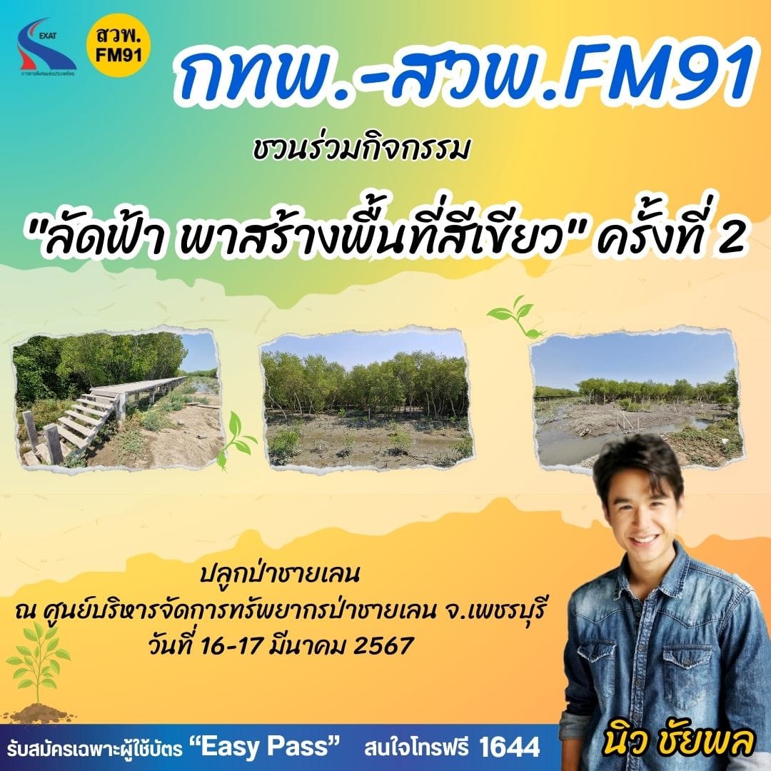การทางพิเศษแห่งประเทศไทย (กทพ.) และ สวพ.FM91 ขอชวนผู้ใช้บัตร EASY PASS สมัครเข้าร่วมโครงการ “ทางด่วนลัดฟ้า ข้ามกรุง” ภายใต้กิจกรรม “ลัดฟ้า พาสร้างพื้นที่สีเขียว” ครั้งที่ 2 ณ ศูนย์บริหารจัดการทรัพยากรป่าชายเลน จ.เพชรบุรี วันที่ 16-17 มีนาคม 2567