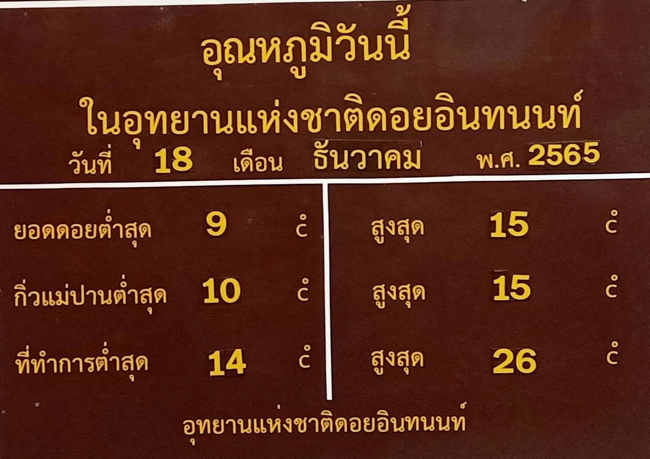 - กิ่วแม่ปาน อุณหภูมิต่ำสุด10°C ที่ทำการอุทยานแห่งชาติดอยอินทนนท์ (กม.31 บ้านขุนกลาง) อุณหภูมิต่ำสุด14°C
