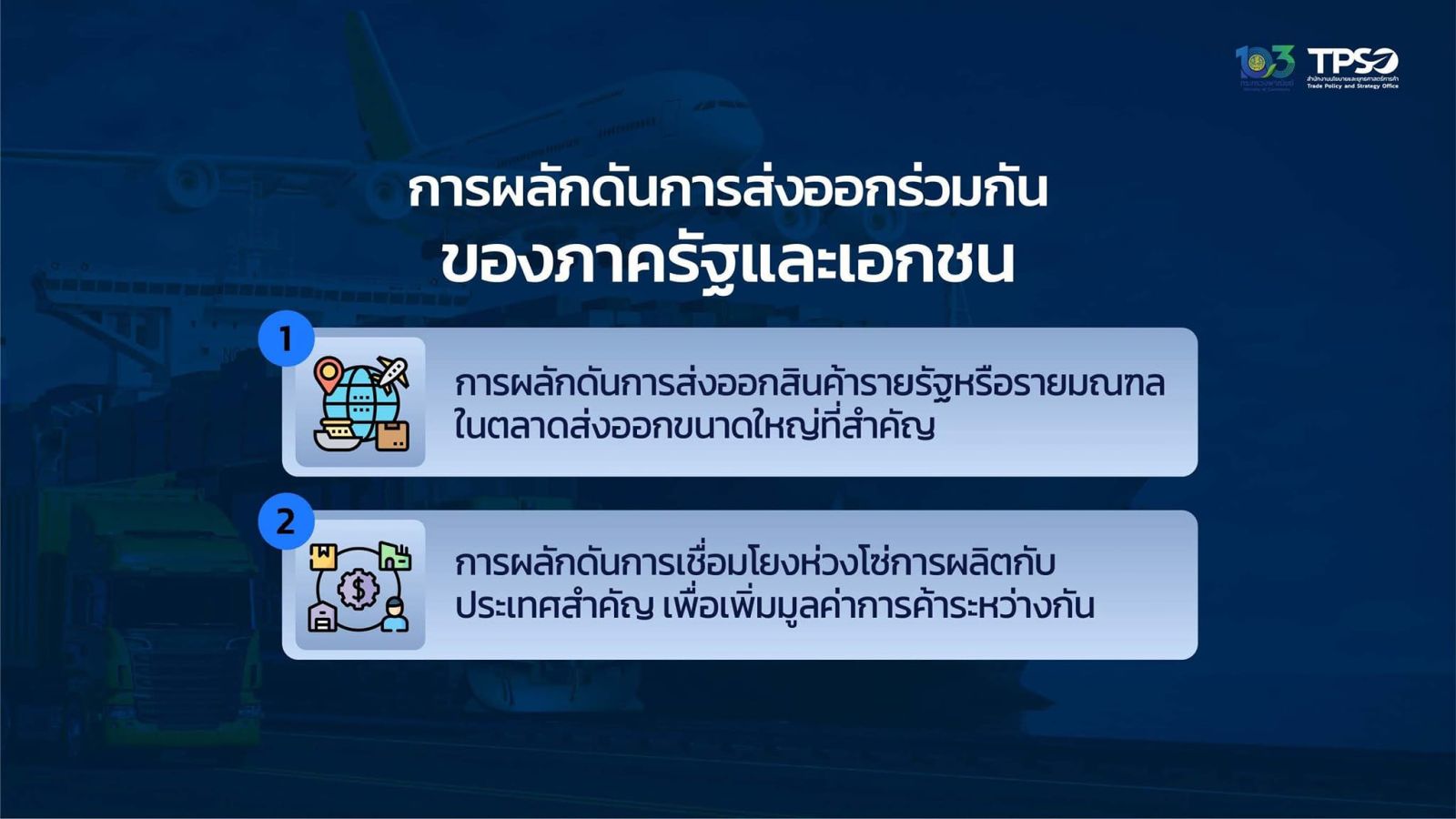 (1) การหารือกับสหรัฐฯ เพื่อลดอุปสรรคในการส่งออก โดยขอให้พิจารณาเร่งรัดการต่ออายุการให้สิทธิพิเศษทางภาษีศุลกากร (GSP) ที่ได้หมดอายุไปเมื่อปลายปี 2563 รวมไปถึงการขอการสนับสนุนให้ไทยหลุดจากบัญชีประเทศที่ต้องจับตามอง (Watch List: WL)
