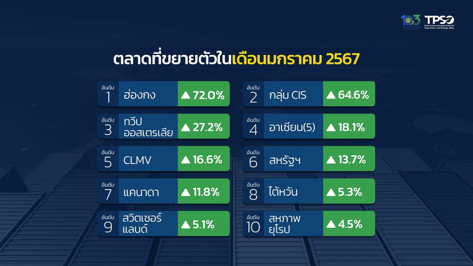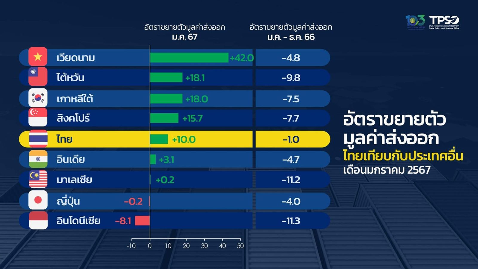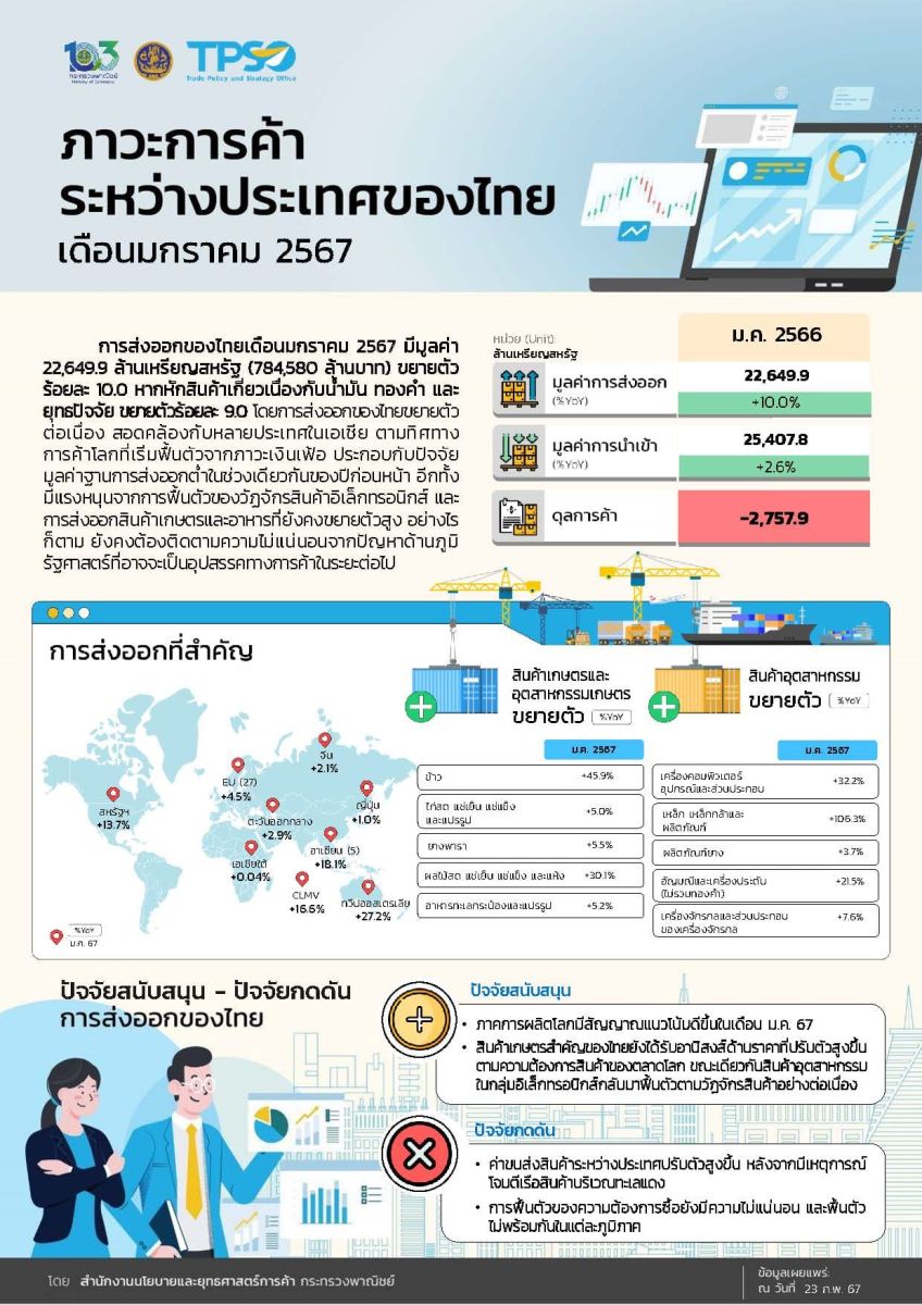 23 กุมภาพันธ์ 2567 นายกีรติ รัชโน ปลัดกระทรวงพาณิชย์ เปิดเผยว่า การส่งออกของไทยในเดือนมกราคม 2567 มีมูลค่า 22,649.9 ล้านเหรียญสหรัฐ (784,580 ล้านบาท) ขยายตัว 10% ต่อเนื่องเป็นเดือนที่ 6 เมื่อเทียบกับเดือนเดียวกันของปีก่อน และ สูงสุดในรอบ 19 เดือนนับตั้งแต่เดือนมิถุนายน 2565 เมื่อหากหักสินค้าเกี่ยวเนื่องกับน้ำมัน ทองคำ และยุทธปัจจัย ขยายตัว 9.2% การส่งออกของไทยยังขยายตัวต่อเนื่อง สอดคล้องกับหลาย ๆ ประเทศในเอเชีย ตามทิศทางการค้าโลกที่เริ่มฟื้นตัวจากภาวะเงินเฟ้อ