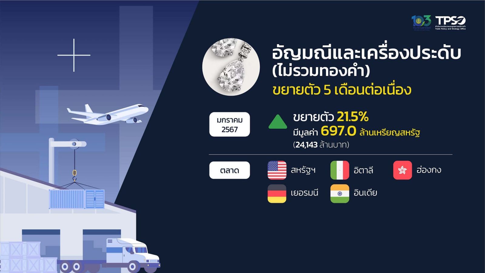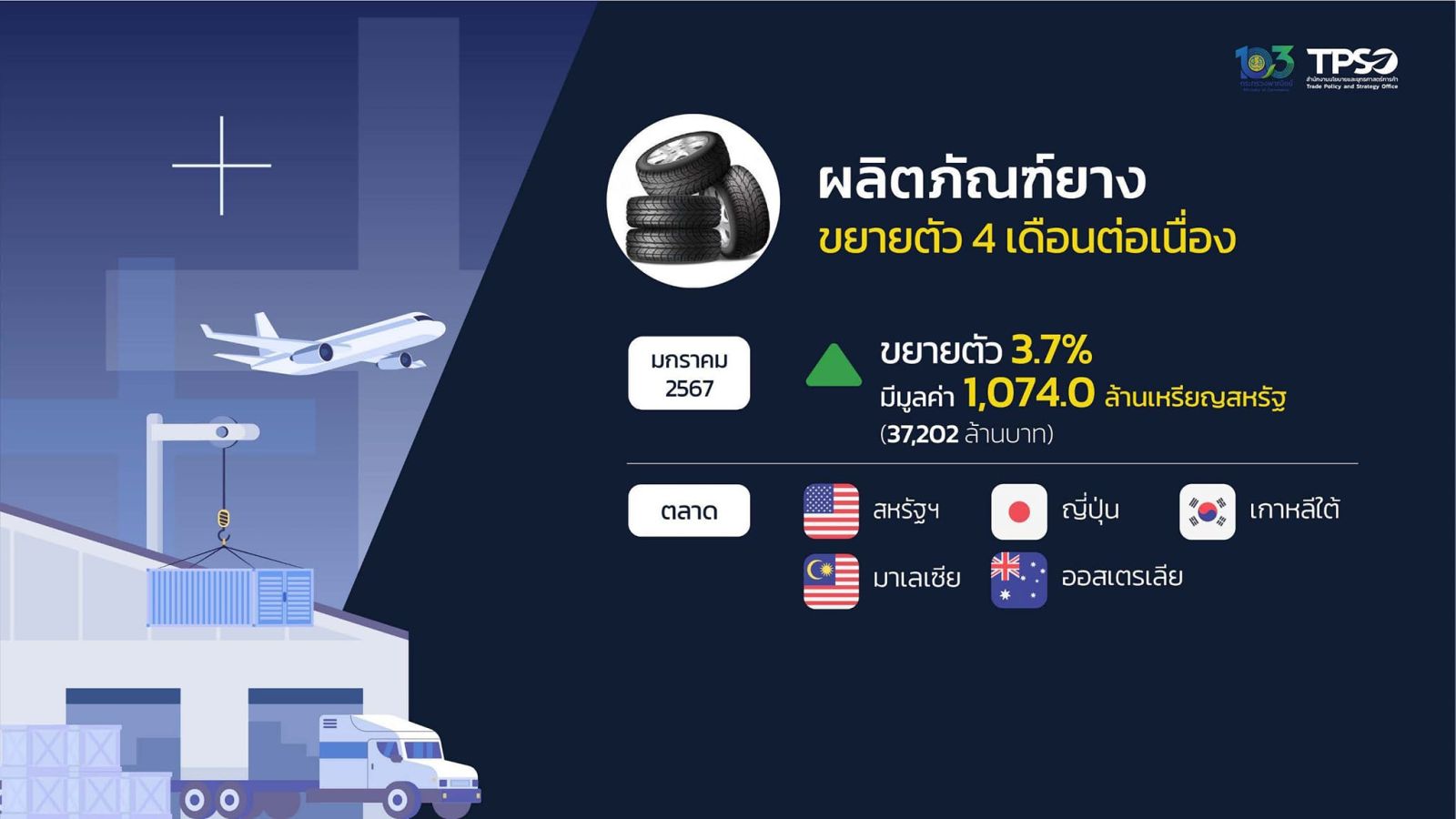 ผลิตภัณฑ์ยาง ขยายตัว 3.7% ขยายตัวต่อเนื่อง 4 เดือน (ขยายตัวในตลาดสหรัฐฯ ญี่ปุ่น เกาหลีใต้ มาเลเซีย และออสเตรเลีย) อัญมณีและเครื่องประดับ (ไม่รวมทองคำ) ขยายตัว 21.5% ขยายตัวต่อเนื่อง 5 เดือน (ขยายตัวในตลาดสหรัฐฯ อิตาลี ฮ่องกง เยอรมนี และอินเดีย)