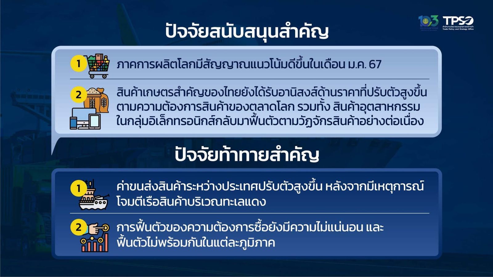 แนวโน้มการส่งออกในปี 2567 การส่งออกไทยยังคงได้รับปัจจัยบวกจากการฟื้นตัวของเศรษฐกิจคู่ค้าตามภาวะเงินเฟ้อโลกที่เริ่มชะลอตัว การได้รับอานิสงส์จากมาตรการรักษาความมั่นคงทางด้านอาหารของหลายประเทศและจากความร่วมมือทางเศรษฐกิจในภูมิภาคที่มีความเข้มแข็ง ขณะที่ความขัดแย้งภูมิรัฐศาสตร์ในตะวันออกกลางยังไม่ส่งผลกระทบทางตรงต่อไทยมากนัก