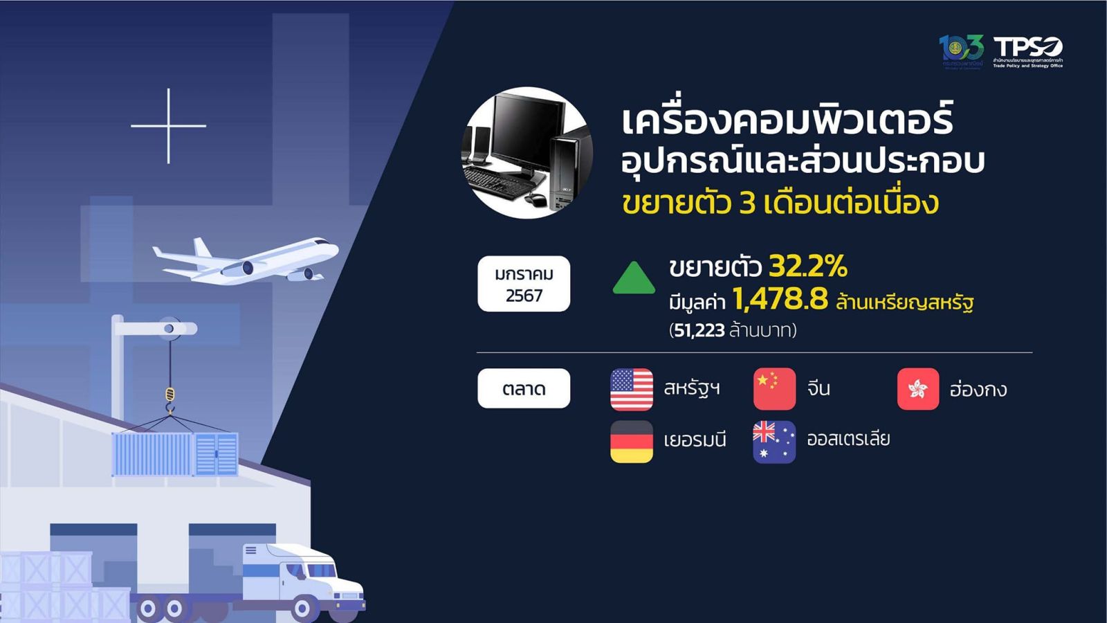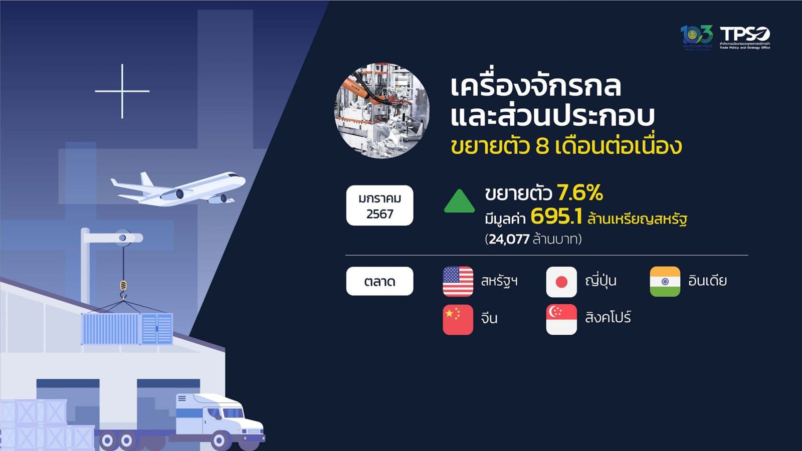 ประกอบกับปัจจัยมูลค่าฐานการส่งออกต่ำในช่วงเดียวกันของปีก่อนหน้า อีกทั้งมีแรงหนุนจากการส่งออกคอมพิวเตอร์และส่วนประกอบตามการฟื้นตัวของวัฏจักรสินค้าอิเล็กทรอนิกส์ และการส่งออกสินค้าเกษตรและอาหารที่ยังคงขยายตัวสูง อย่างไรก็ตาม ยังคงต้องติดตามความไม่แน่นอนจากปัญหาด้านภูมิรัฐศาสตร์ที่อาจจะเป็นอุปสรรคทางการค้าในระยะต่อไป ส่วนการนำเข้าเดือนมกราคม 2567 มีมูลค่า 25,407.8 ล้านเหรียญสหรัฐ ขยายตัว 2.6%เมื่อเทียบช่วงเดียวกันของปีก่อน ส่งผลให้ไทย ขาดดุล 2,757.9 ล้านเหรียญสหรัฐ