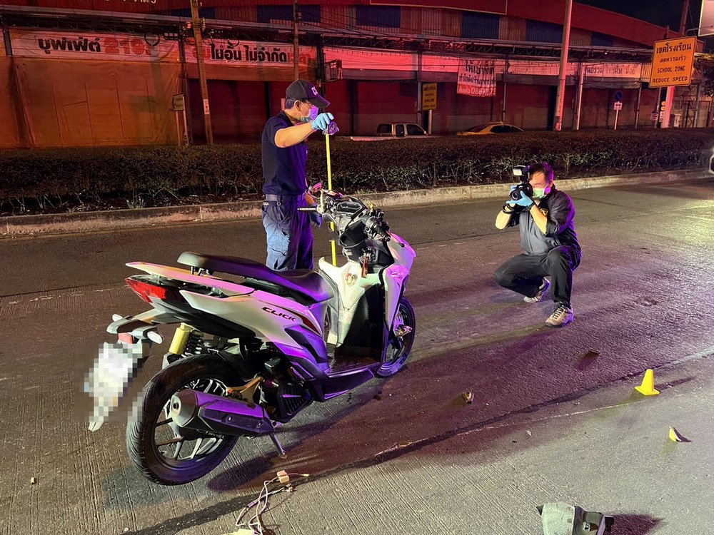 ที่เกิดเหตุพบรถ จยย.ยี่ห้อ ฮอนด้า รุ่น คลิก สีขาว ทะเบียน กทม. สภาพด้านหน้ารถพังเสียหายลมคว่ำอยู่กลางถนน ใกล้กันพบร่างผู้เสียชีวิต ทราบชื่อต่อมาคือ นายสอาด อายุประมาณ 40 ปี และยังมีผู้บาดเจ็บเป็นเด็กชาย อายุประมาณ 7 ขวบได้รับบาดเจ็บกู้ภัยนำส่งโรงบาลพระนั่งเกล้าไปก่อนหน้านี้