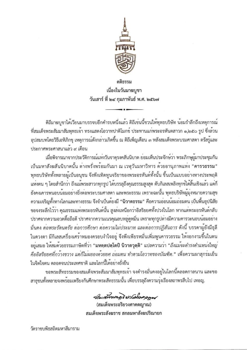 เนื่องในวันมาฆบูชา ๒๔ กุมภาพันธ์ ๒๕๖๗ เจ้าพระคุณ สมเด็จพระอริยวงศาคตญาณ สมเด็จพระสังฆราช สกลมหาสังฆปริณายก ประทานพระคติธรรม ความว่า