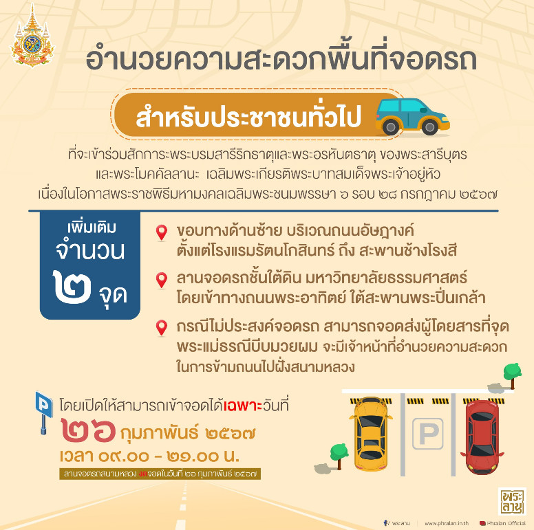 อำนวยความสะดวกพื้นที่จอดรถสำหรับประชาชนทั่วไปที่จะเข้าร่วมสักการะพระบรมสารีริกธาตุ และพระอรหันตธาตุของพระสารีบุตรและพระโมคคัลลานะ