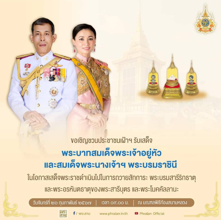 ขอเชิญชวนประชาชนเฝ้าฯ รับเสด็จ พระบาทสมเด็จพระเจ้าอยู่หัว และสมเด็จพระนางเจ้าฯ พระบรมราชินี ในโอกาสเสด็จพระราชดำเนินไปในการถวายสักการะ พระบรมสารีริกธาตุ และพระอรหันตธาตุของพระสารีบุตร และพระโมคคัลลานะ วันจันทร์ที่ ๒๖ กุมภาพันธ์ ๒๕๖๗ เวลา ๐๙.๐๐ น. ณ มณฑลพิธีท้องสนามหลวง