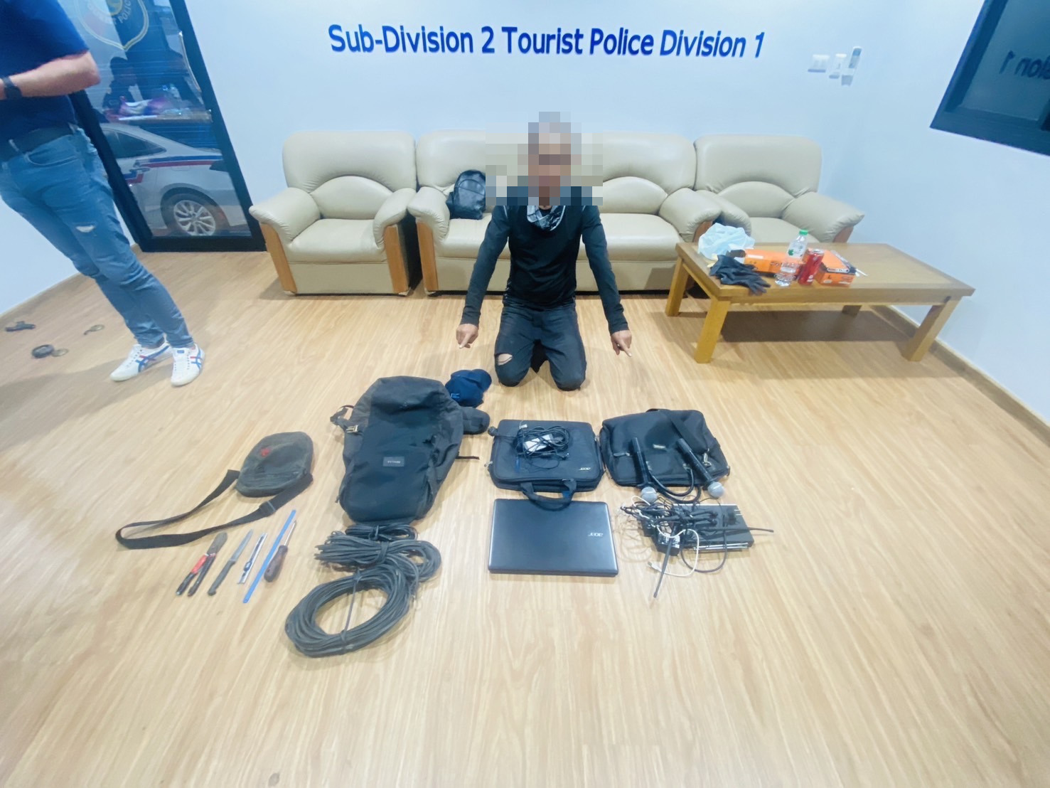 สืบเนืองมาจากเมื่อช่วงเวลาประมาณ 17.00 น. ที่ผ่านมา ผู้ประกอบการ ได้แจ้งมายังศูนย์รับแจ้งเหตุของตำรวจท่องเที่ยว 1155 ว่าถูกลักทรัพย์ระหว่างทำงานตั้งเวทีเพื่อให้นักท่องเที่ยวมาร้องเพลงบริเวณริมถนน ภายในซอยจอมเทียน ซอย 1 โดยมีคอมพิวเตอร์โน๊ตบุ๊คยี่ห้อ acer พร้อมสายชาร์ต , ชุดเครื่องเสียงไมค์โครโฟนไร้สาย , เครื่องรับสัญญาณไมโครโฟน โดยหลังรับแจ้งเจ้าหน้าที่ตำรวจงานสืบสวน กก.2 บก.ทท.1 ได้ออกติดตามคนร้ายในเหตุดังกล่าว