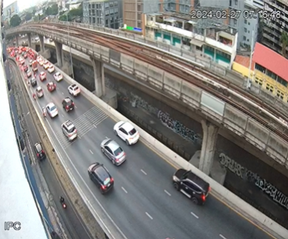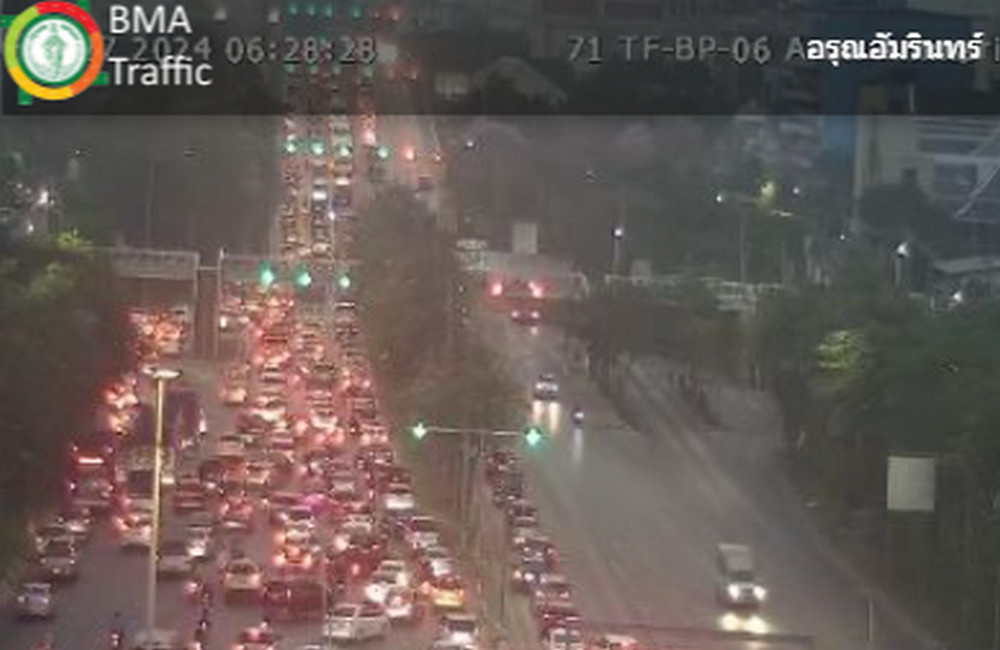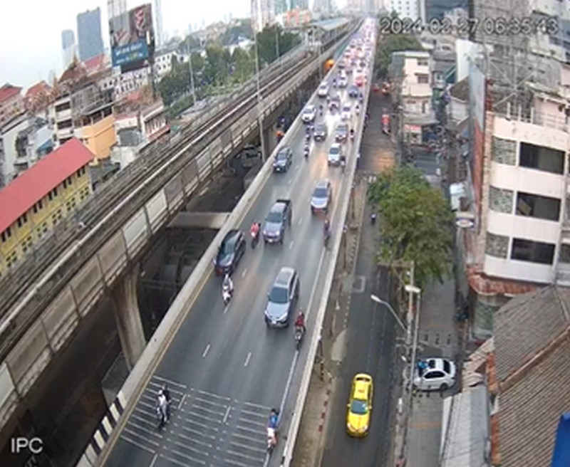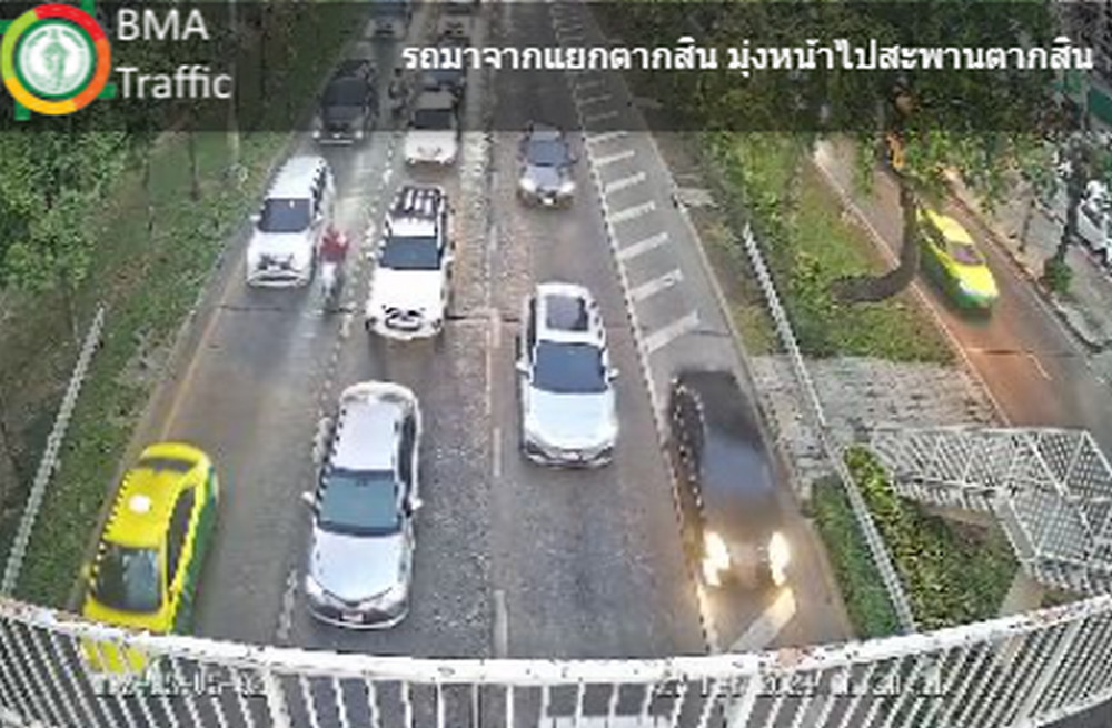- สะพานสมเด็จพระเจ้าตากสิน ขาเข้า เริ่มติดขัด ท้ายแถวสะสมอยู่ที่หน้าอาคารสินสาทรทาวเวอร์