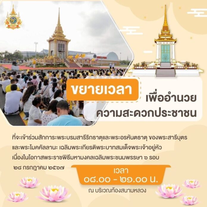 ล่าสุด วธ.แจ้ง ขยายเวลาเพื่ออำนวยความสะดวกแก่ประชาชนที่จะเข้าร่วมสักการะฯ เป็นเวลา 08.00 น.-21.00 น. ทั้งนี้ ภายในบริเวณมณฑปที่จัดงาน มีการจัดนิทรรศการ “การอัญเชิญพระบรมสารีริกธาตุและพระอรหันตธาตุของพระสารีบุตรและพระโมคคัลลานะ จากพิพิธภัณฑสถานแห่งชาติอินเดียมาประดิษฐานเป็นการชั่วคราว ณ ประเทศไทย เฉลิมพระเกียรติพระบาทสมเด็จพระเจ้าอยู่หัวเนื่องในโอกาสพระราชพิธีมหามงคลเฉลิมพระชนมพรรษา 6 รอบ 28 กรกฎาคม 2567” ให้ความรู้ประกอบการสักการะ