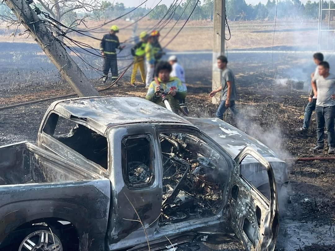เบื้องต้น ทราบว่า คนขับได้พาหลานไปหาหมอที่โรงพยาบาลขอนแก่น และกำลังเดินทางกลับอำเภอกุฉินารายณ์ ระหว่างทางขากลับ คนขับมีอาการเพลียแล้วหลับใน รถได้เสียหลักลงข้างทางชนกับเสาไฟฟ้า จนเกิดเพลิงไหม้ดังกล่าว ทางเจ้าหน้าที่ตำรวจ สภ.โนนสูง เข้าตรวจสอบเก็บหลักฐาน และจะสอบสวนคนขับเพิ่มเติมเพื่อดำเนินการตามกฎหมายต่อไป