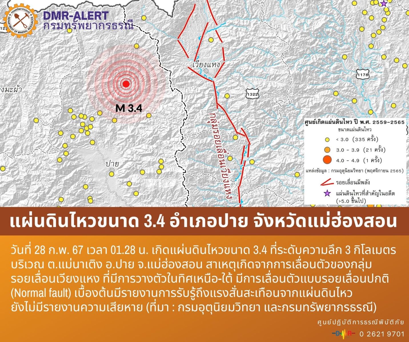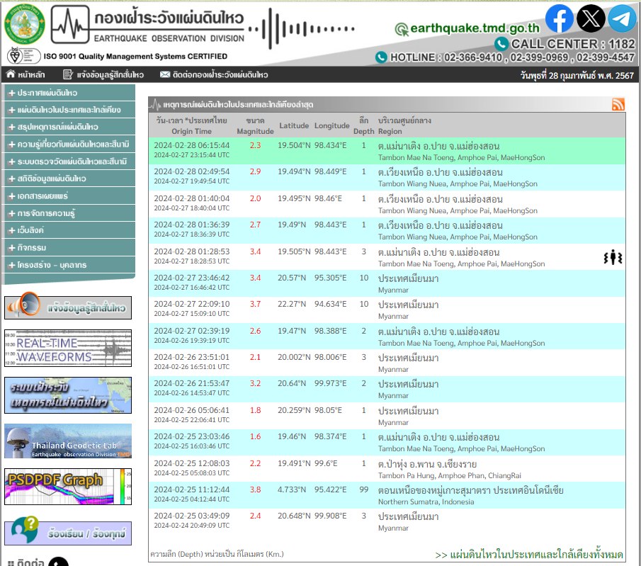 28 กุมภาพันธ์ 2567 กองเฝ้าระวังแผ่นดินไหว กรมอุตุนิยมวิทยา รายงานเหตุ แผ่นดินไหวขนาด 3.4 ระดับความลึก 3 กิโลเมตร บริเวณ ต.แม่นาเติง อ.ปาย จ.แม่ฮ่องสอน เมื่อเวลา 01.28 น.ที่ผ่านมา เบื้องต้นมีประชาชนใน ต.เวียงใต้ อ.ปาย จ.แม่ฮ่องสอน แจ้งรับรู้ถึงแรงสั่นสะเทือนจากแผ่นดินไหว ระบุ "รู้สึกบ้านสั่นสะเทือน" แต่ยังไม่มีรายงานความเสียหาย
