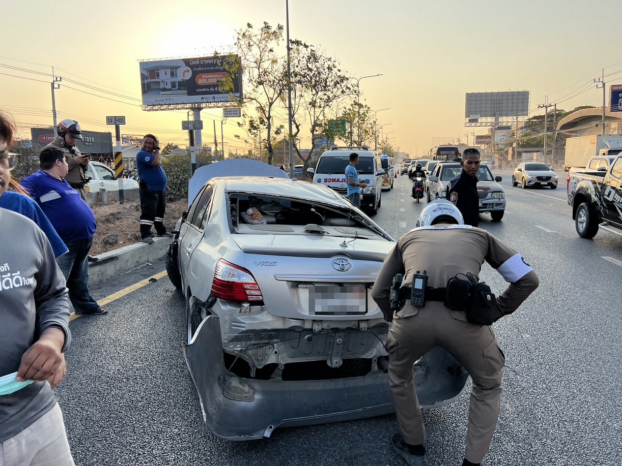 ที่เกิดเหตุถถนฝั่งขาเข้า มุ่งหน้าสะพานพระรามสี่ ในช่องทางขวาสุด พบรถนั่งส่วนบุคคล ยี่ห้อโตโยต้า รุ่นวีออส สีเทา ทะเบียน กทม. สภาพรถพังเสียหายยับเยิน กระจกด้านหลังแตก กระชนหน้ารถหลุด ขอบซีเมนต์ขอบทางพังเสียหาย พบนาย บอม (นามสมมุติ) อายุ 23 ปี คนขับได้รับบาดเจ็บปากแตก ศีรษะปูดบวม ยังอยู่ในอาการมึนงง