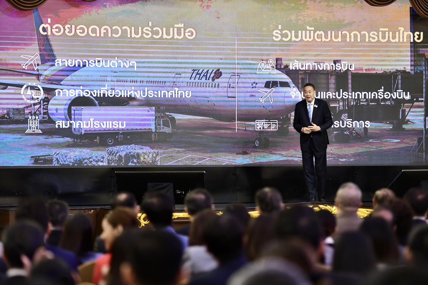 นายกรัฐมนตรี กล่าวว่า สำหรับสายการบินไทย สายการบินแห่งชาติ เป็นความภาคภูมิใจของคนไทยทุกคน การพัฒนาต่อไปจะไปไม่ได้ ถ้าสายการบินไทยไม่แข็งแรง ต้องมีการบริหารให้เหมาะสม ทั้งลักษณะเครื่องบิน จะต้องมีการพัฒนาระบบตั๋วที่หลายประเทศใช้ระบบออนไลน์ วันนี้เราต้องพูดตรงไปตรงมาว่า การบินไทยมีตัวแทนขายตั๋วเยอะ เขามีการกั๊กตั๋ว แต่ขึ้นเครื่องไปบางทีว่าง อันนี้เป็นเรื่องที่เราไม่อยากพูด แต่วันนี้ไม่ได้มาว่ากัน เราต้องพัฒนาให้ดีขึ้น หลายสายการบินใช้ออนไลน์บุ๊คกิ้งบริหารราคาตั๋วเพื่อกำไร ตรงนี้เราต้องให้ความสำคัญ เข้าใจอย่างตรงจุด เรื่องเหล่านี้เราคาดหวังว่าการบินไทยต้องทำได้ และการจัดตารางไฟท์ต้องมาพูดกัน เราทราบกันดีการบินไทยอยู่ระหว่างการฟื้นฟู หลังจากเกิดโควิด19 ในวันนี้รักษาตัวเองให้ดี หากหลุดพ้นจากแผนฟื้นฟูแล้วเรามาให้น้ำใจผู้โดยสารทุกคนที่ให้ความเชื่อมั่นเรา ทั้งนี้เราต้องมีความทะเยอทะยาน ให้การบินไทยติดอันดับโลกอย่างน้อยต้องติดอันดับ 3 ของเอเชีย คนไทยต้องภาคภูมิใจ
