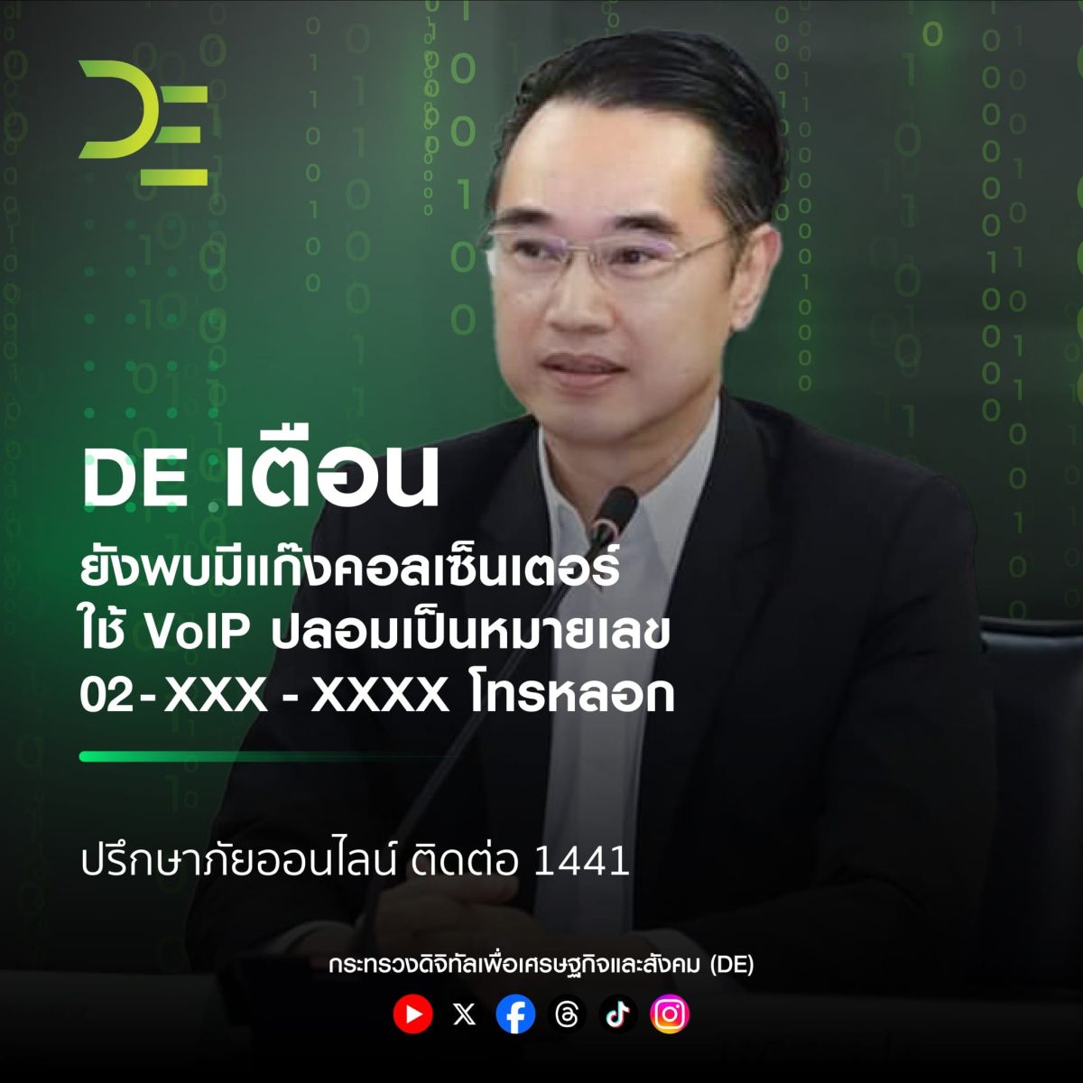 1 มีนาคม 2567 นายเวทางค์ พ่วงทรัพย์ รองปลัดกระทรวงดิจิทัลเพื่อเศรษฐกิจและสังคม (ดีอี) เผยว่า ดีอี พบยังมีแก๊งคอลเซ็นเตอร์ โทรจากต่างประเทศ ด้วยวิธี โทรผ่านอินเทอร์เน็ต VoIP (Voice over Internet Protocol) ปลอมเป็นหมายเลข 02-XXX-XXXX โทรติดต่อ หรือ ส่ง SMS หาประชาชน เพื่อเลี่ยงการขึ้นเครื่องหมาย + หน้าหมายเลขโทรศัพท์ หรือไม่ให้แสดงว่าเป็นการติดต่อจากต่างประเทศ