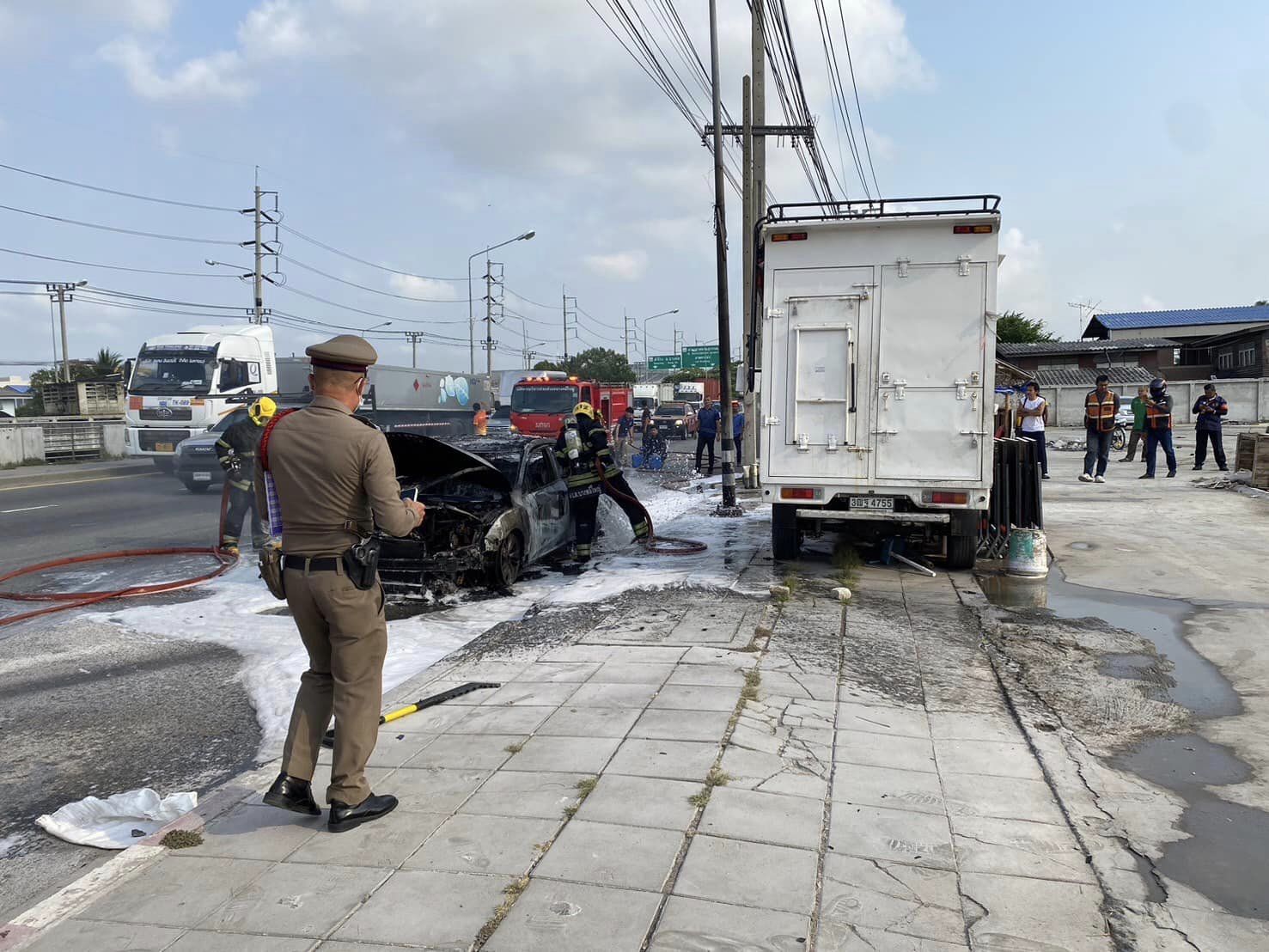 ที่เกิดเหตุ พบว่าเพลิงกำลังลุกไหม้ รถนั่งส่วนบุคคล ฮอนด้า ซีวิค สีดำ ป้ายทะเบียน กรุงเทพมหานคร ที่จอดอยู่บนถนนเลนซ้าย เพลิงโหมลุกไหม้รุนแรง เจ้าหน้าที่พร้อมด้วยรถดับเพลิง ร่วมระดมใช้หัวฉีดน้ำและน้ำยาเคมีในการควบคุม และเพลิงสงบในเวลาต่อมา ตรวจสอบพบว่าเสียหายหมดทั้งคัน ขณะเกิดเหตุไม่พบผู้บาดเจ็บหรือเสียชีวิต สาเหตุอยู่ระหว่างการสอบสวนของเจ้าหน้าที่ตำรวจ สภ.บางพลี