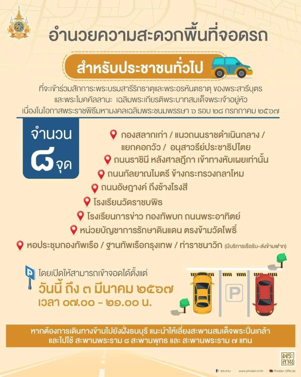 - จุดจอดรถที่ 8 หอประชุมกองทัพเรือ/ฐานทัพเรือกรุงเทพ/ท่าราชนาวิก (กรมเจ้าท่าให้บริการรับ-ส่งข้ามฟาก) โดยเปิดให้สามารถเข้าจอดได้ตั้งแต่ วันนี้ - 3 มีนาคม 2567 เวลา 07.00 น. - 21.00 น.