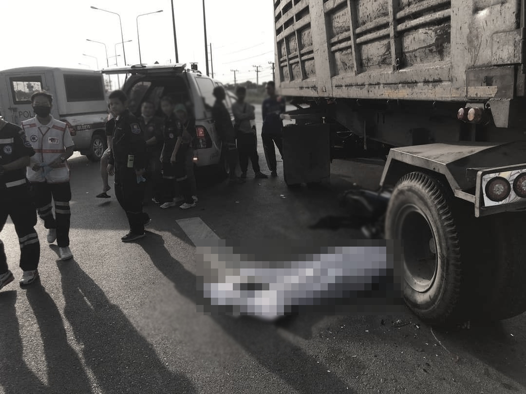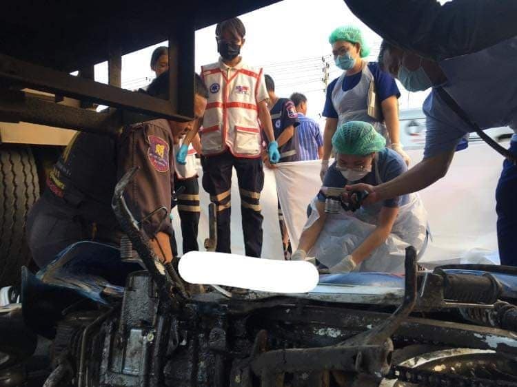คุณตาวัย 73 ขี่รถจักรยานยนต์ เฉี่ยวชนกับกระบะ ก่อนร่างกระเด็นเข้าใต้ท้องรถพ่วง เสียชีวิตกลางถนนพระราม 2