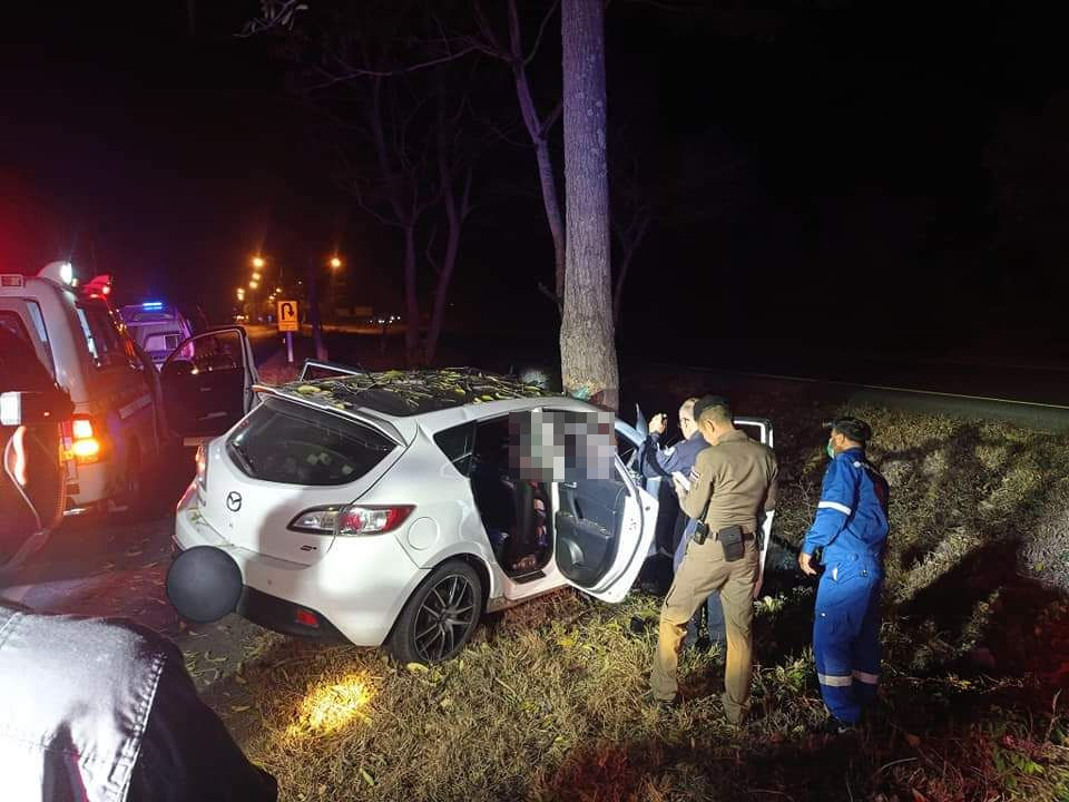 รถเก๋งเสียหลักชนต้นไม้ริมถนนทางหลวงหมายเลข 1 เสียชีวิต 2 คนร่างติดค้างภายในยานพาหนะ จ.พะเยา