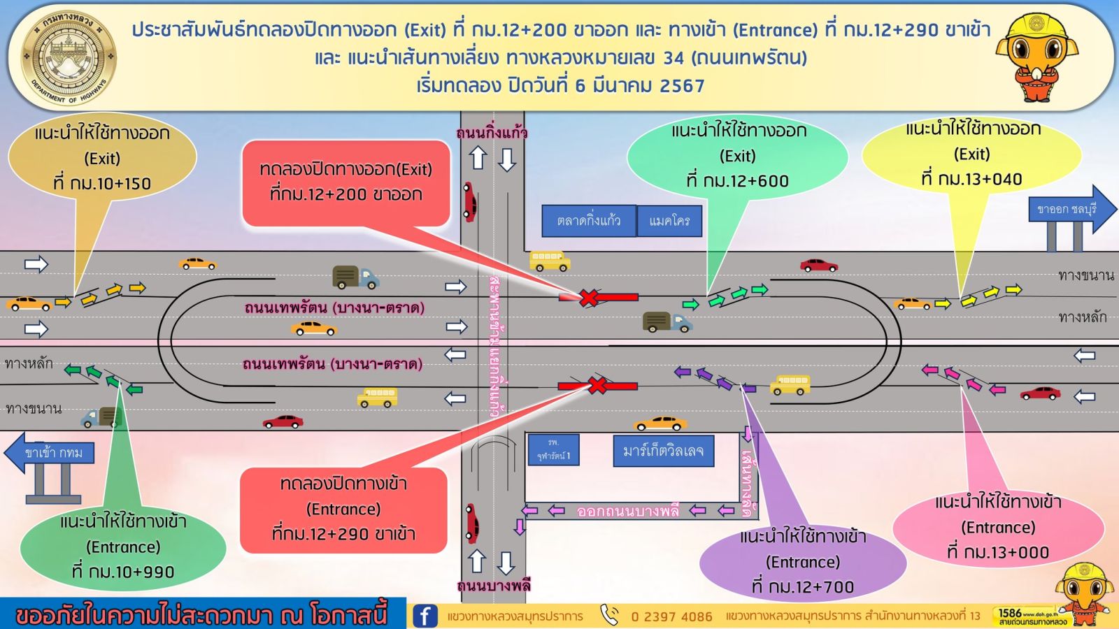 ตั้งแต่วันที่ 6 มีนาคม 2567 แขวงทางหลวงสมุทรปราการ จะทำการทดลองปิดทางออกและทางเข้า ถ.เทพรัตน (บางนาตราด) ตลอด 24 ชม.