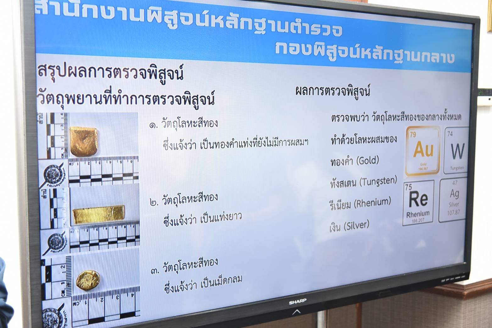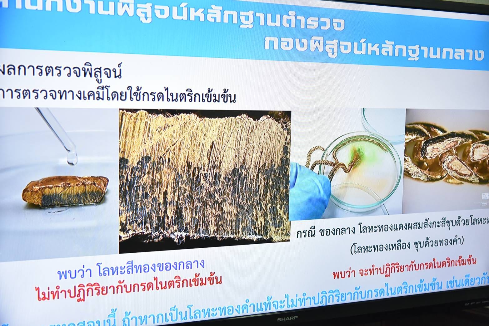 ผบช.สพฐ.ตร. กล่าวว่า ผลการตรวจพิสูจน์ของกลุ่มงานตรวจทางเคมี ฟิสิกส์ กองพิสูจน์หลักฐานกลาง พบว่าโลหะที่ใช้ผสมกับโลหะทองคำเป็นธาตุโลหะรีเนียม (Rhenium) และทังสเตน (Tungsten) ซึ่งไม่สามารถใช้เทคนิคพื้นฐาน เช่น หยดกรด เผาไหม้ หรือใช้เครื่องมือ X-ray ขนาดเล็กในการตรวจวิเคราะห์เจอได้จำเป็นต้องใช้เครื่องมือวิทยาศาสตร์ขั้นสูงในการตรวจพิสูจน์ โดยสิ่งที่น่ากังวลของพฤติการณ์นี้คือร้านขายทองต้องใช้เครื่องมือ 'X-ray Fluorescence (XRF) ที่ตั้งค่าให้ตรวจจับธาตุโลหะรีเนียม และทังสเตน ตรวจสอบทองคำได้เท่านั้นจึงจะทราบผล ทองแท้หรือทองปลอมแปลง ซึ่งปัจจุบันผู้ประกอบการรายย่อยส่วนมากยังไม่มีเครื่องมือดังกล่าวเนื่องด้วยราคาแพง ส่วนร้านที่มีเครื่อง XRF แล้ว แต่ยังไม่ได้ปรับค่าให้ตรวจธาตุโลหะรีเนียม และ ทังสเตน ก็ไม่สามารถตรวจพิสูจน์ได้เช่นกัน ฉะนั้นขอให้ผู้ประกอบการที่มีเครื่องมือดังกล่าวปรับการตั้งค่า ใหม่เพื่อให้รองรับ กลยุทธ์ของมิจฉาชีพที่เปลี่ยนไป