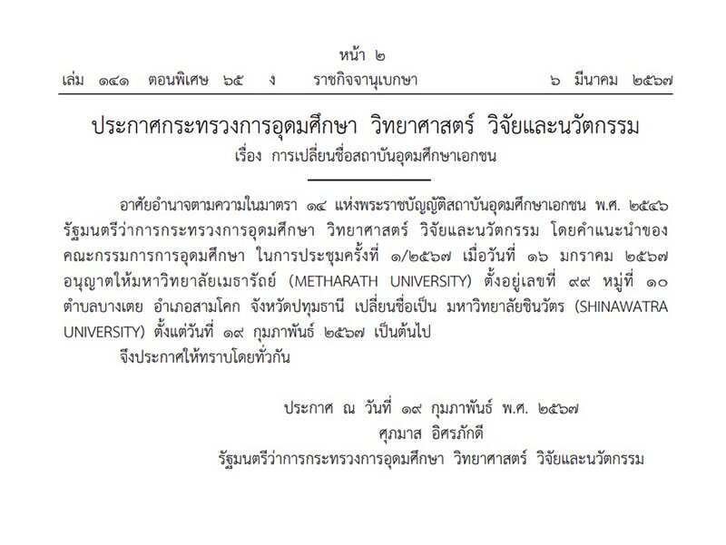 อนุญาตให้มหาวิทยาลัยเมธารัถย์ (METHARATH UNIVERSITY) ตั้งอยู่เลขที่ 99 หมู่ที่ 10 ตำบลบางเตย อำเภอสามโคก จังหวัดปทุมธานี เปลี่ยนชื่อเป็น มหาวิทยาลัยชินวัตร (SHINAWATRA UNIVERSITY) ตั้งแต่วันที่ 19 กุมภาพันธ์ 2567 เป็นต้นไป